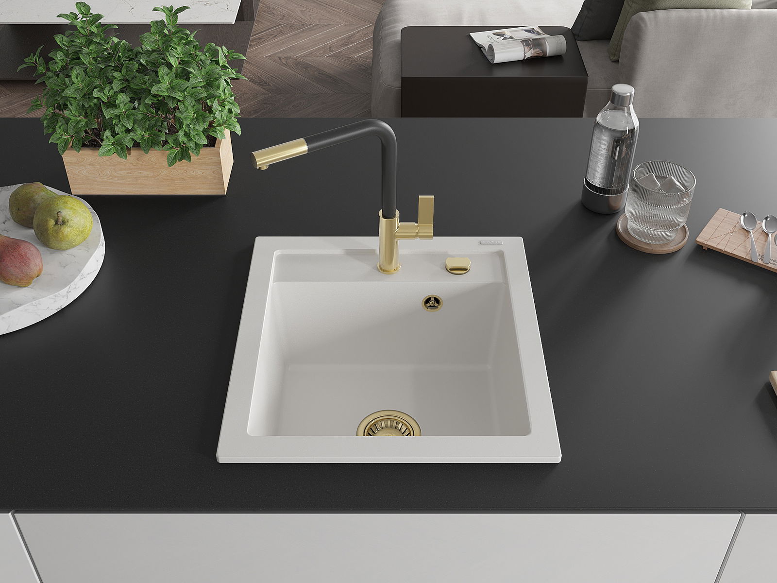 Mexen Vito granitový dřez 1-komorový s kuchyňskou baterií Flora, bílá - 6503-20-670401-57-G