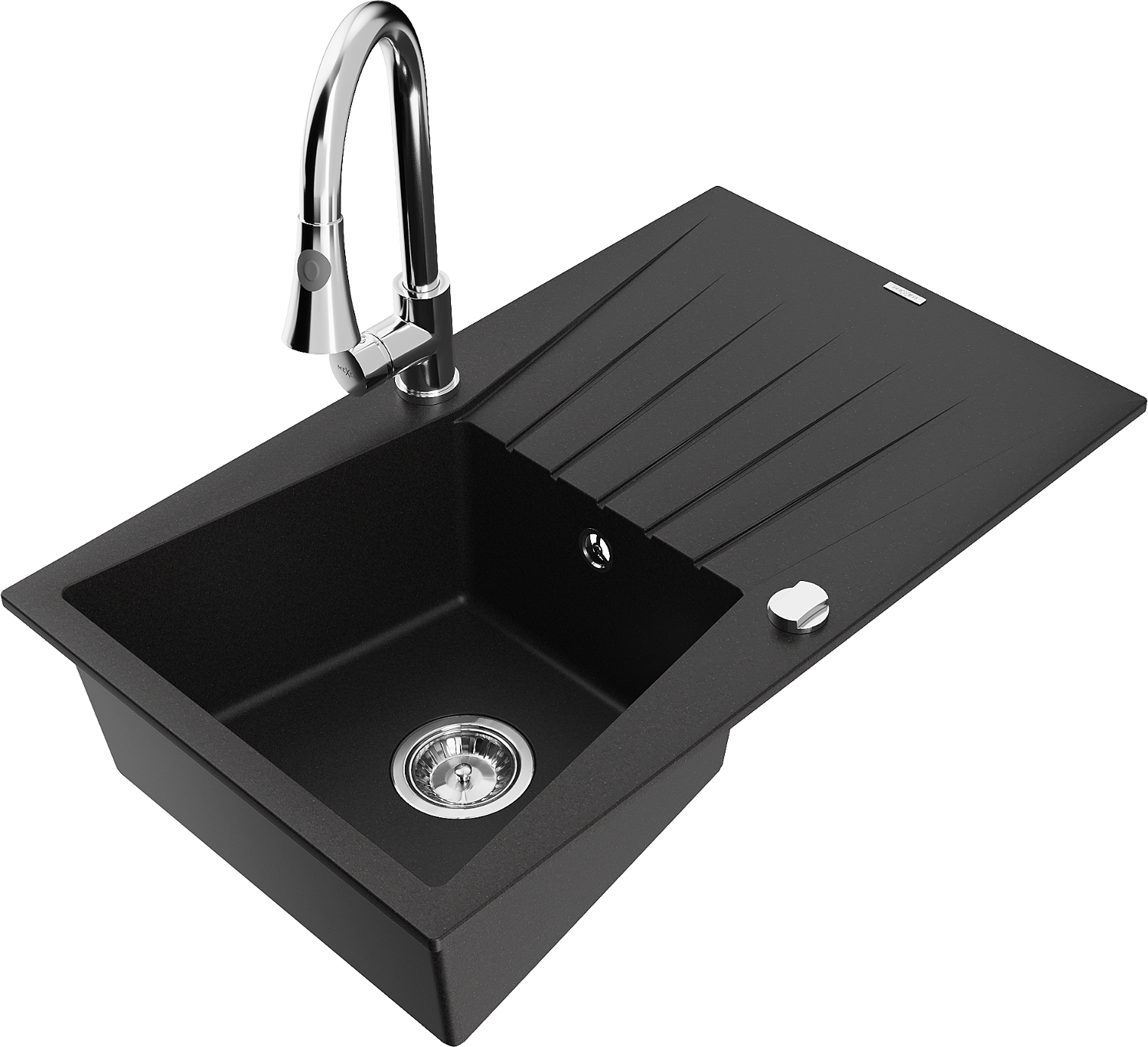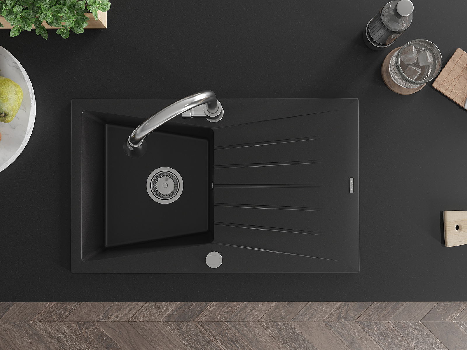 Mexen Cesar granitový dřez 1-komorový s odkapávačem a kuchyňskou baterií Elia, černý - 6514-77-670101-00