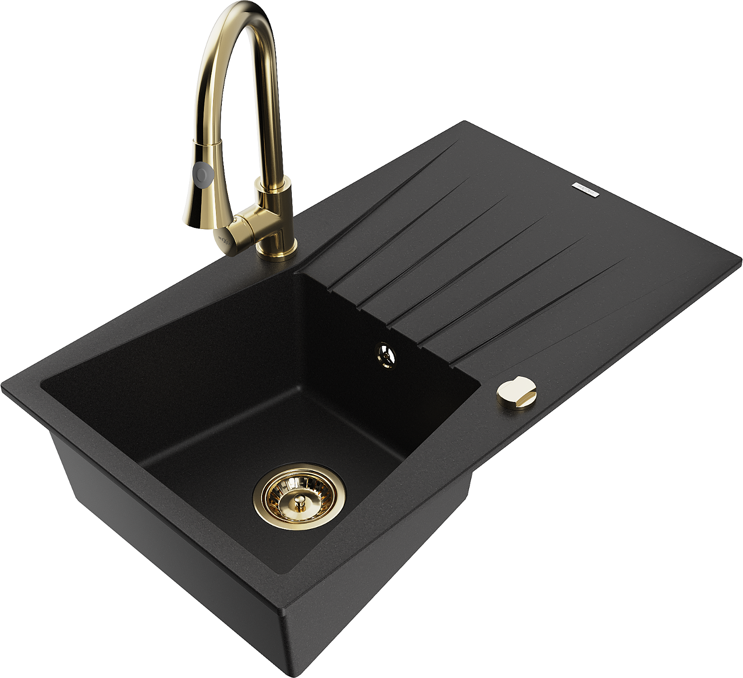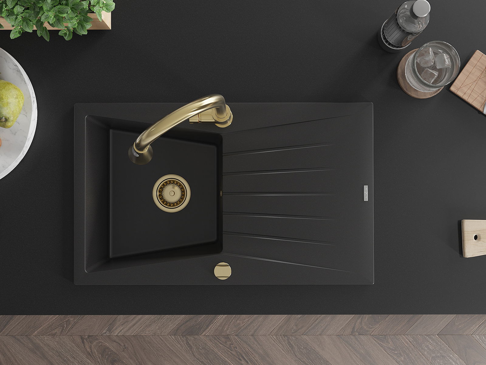 Mexen Cesar granitový dřez 1-komorový s odkapávačem a kuchyňskou baterií Elia, černý - 6514-77-670101-50