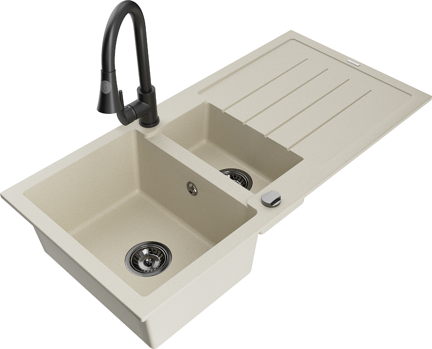 Mexen Andres granitový dřez 1,5-komorový s odkapávačem a kuchyňským kohoutkem Elia, béžový - 6515-69-670101-70