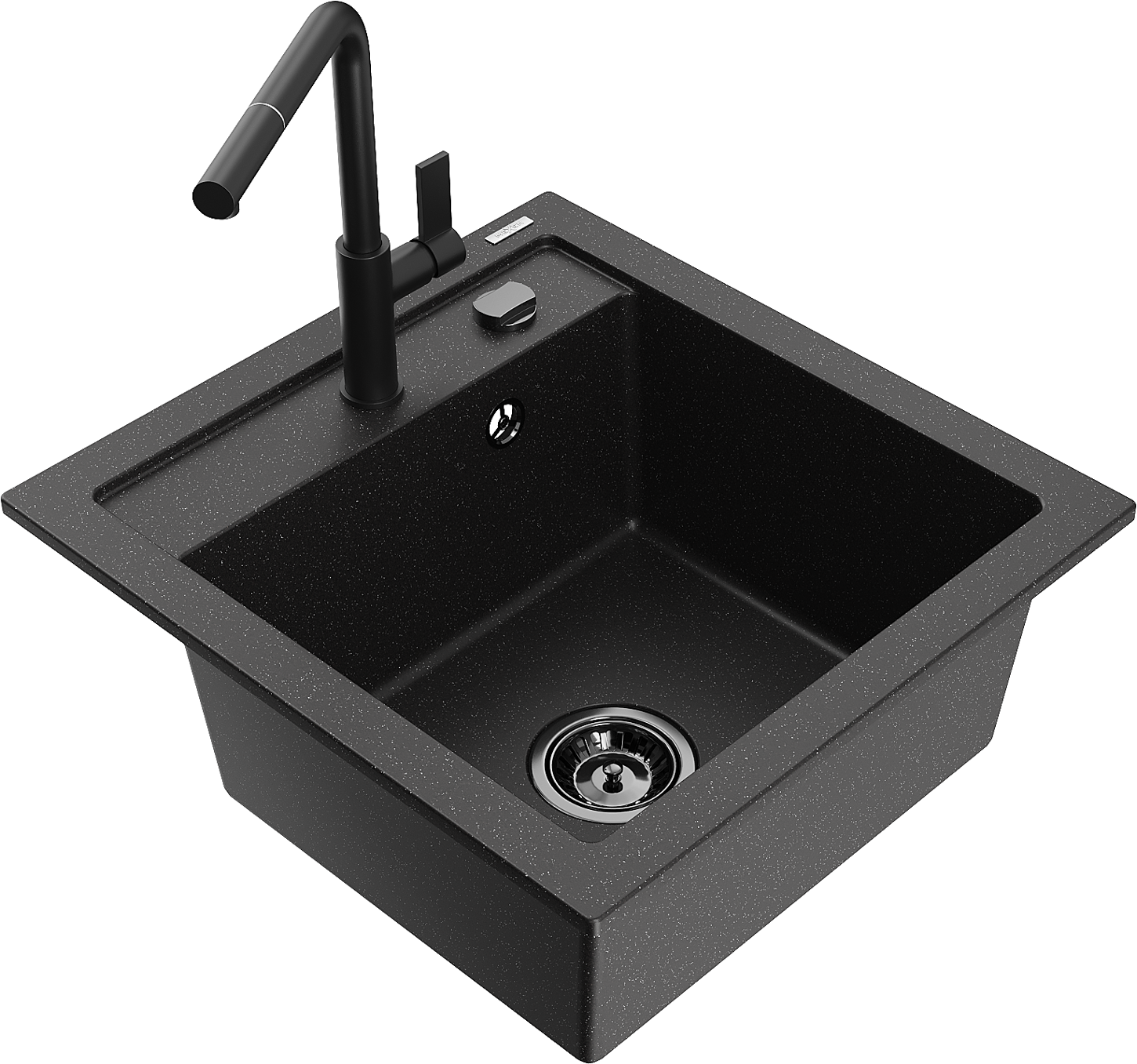 • Mexen Vito granitový dřez 1-komorový s kuchyňskou baterií Flora, černý/stříbrný metalický - 6503-73-670401-70-B