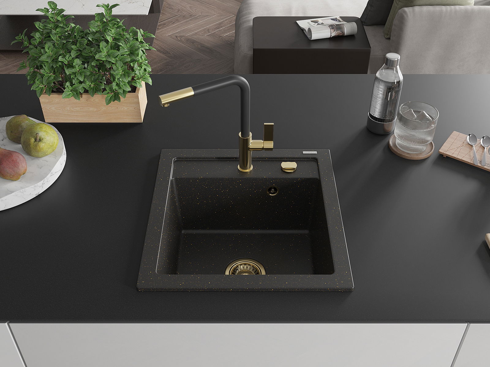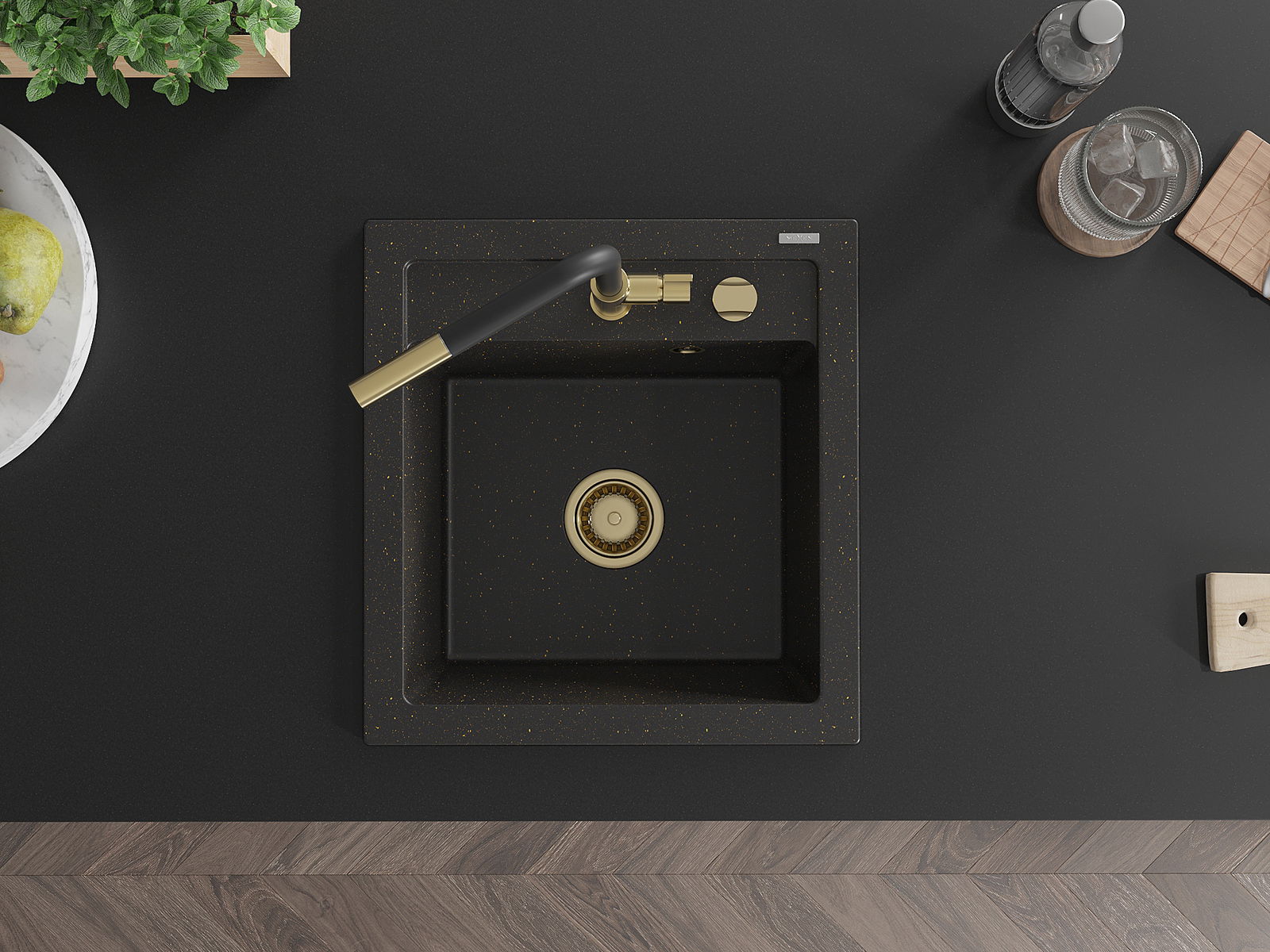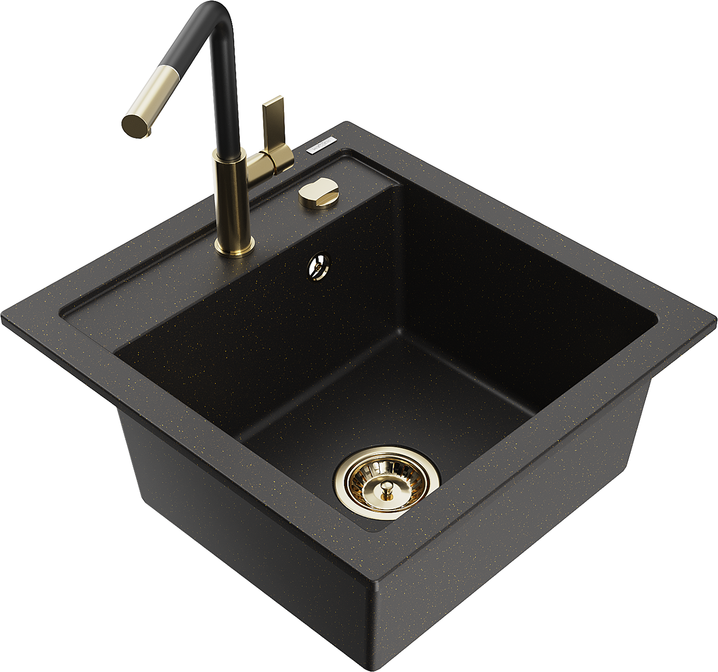 Mexen Vito granitový dřez s 1 komorou a kuchyňskou baterií Flora, černý/zlatý metalik - 6503-75-670401-57-G