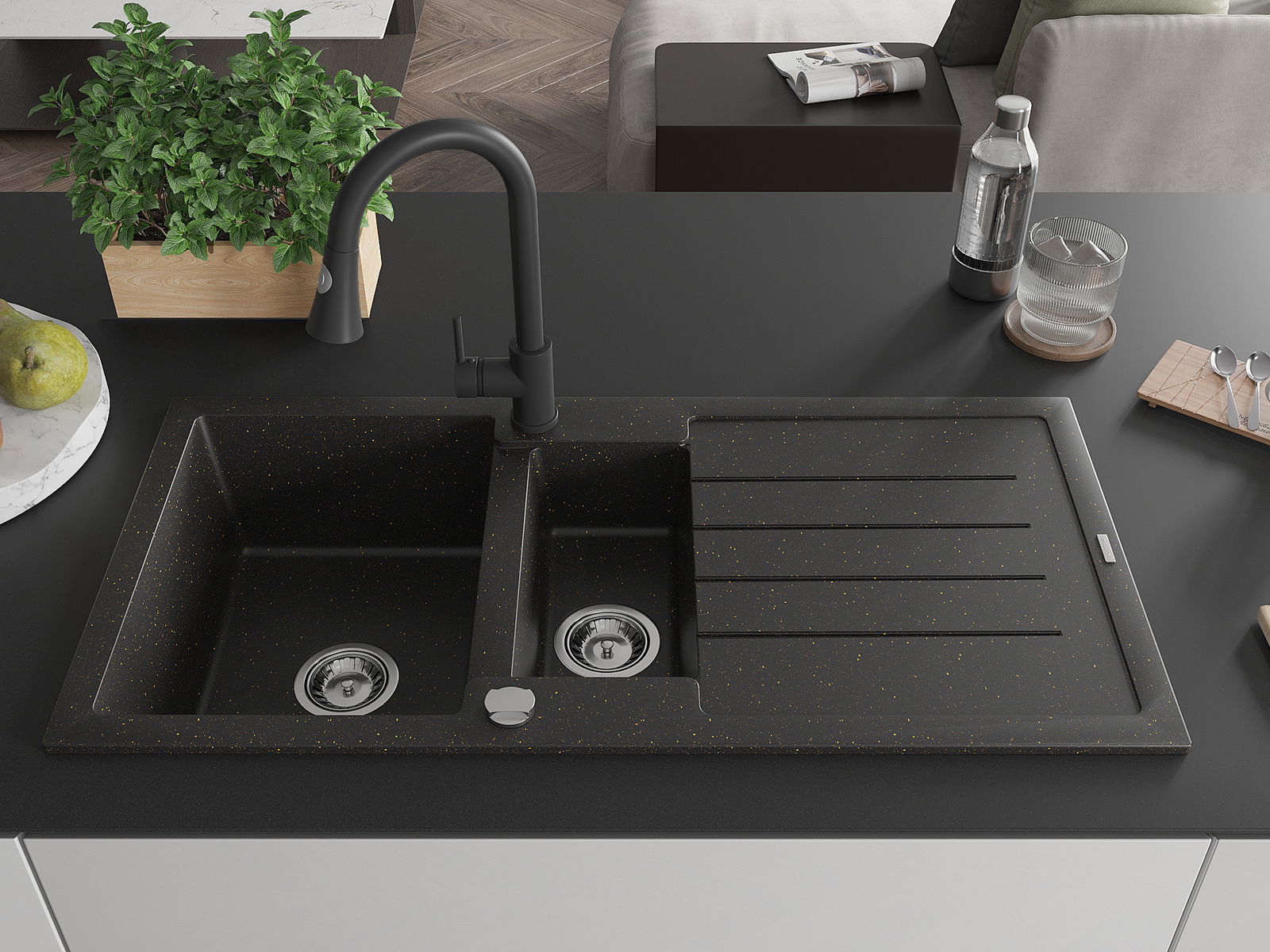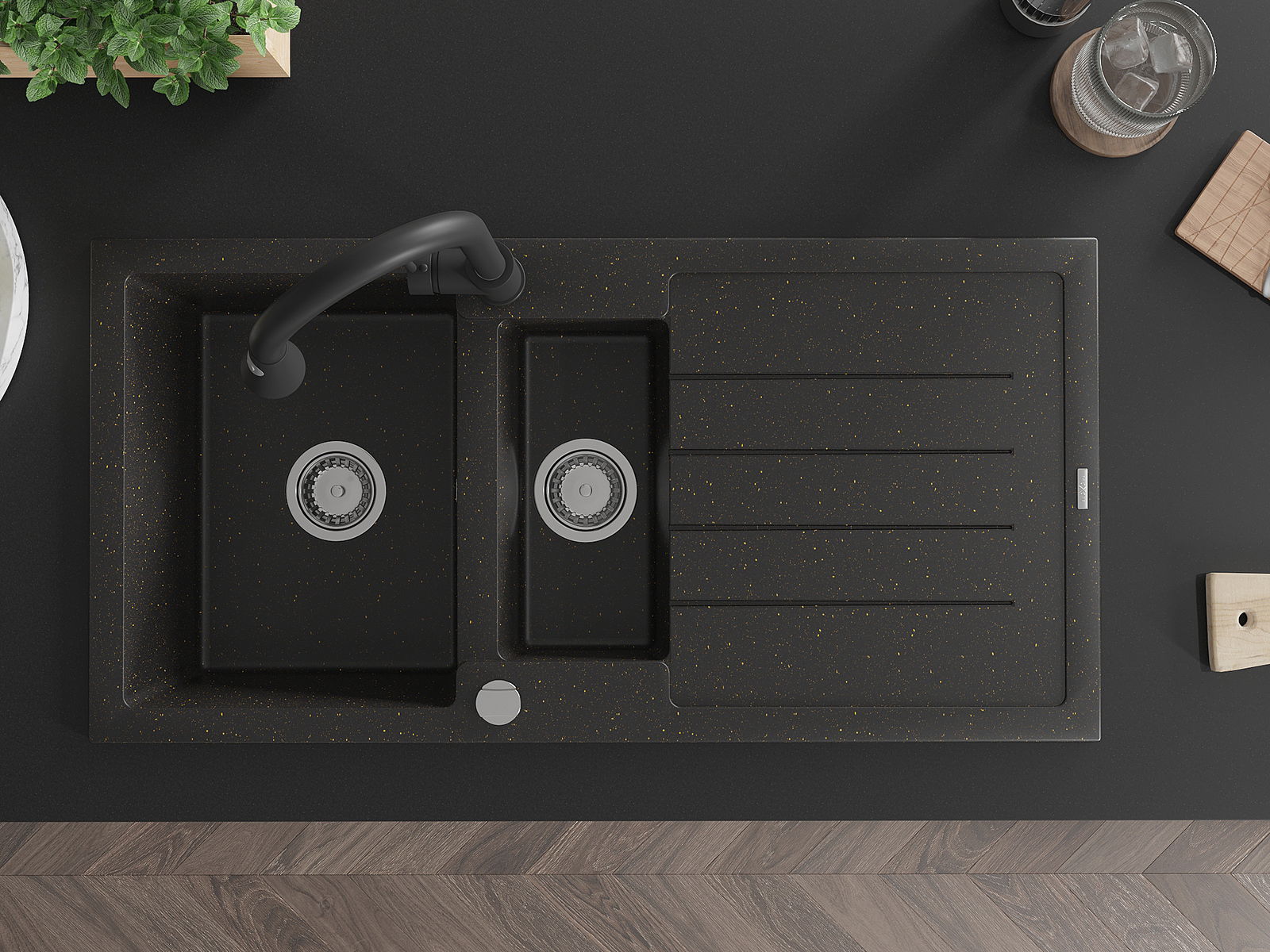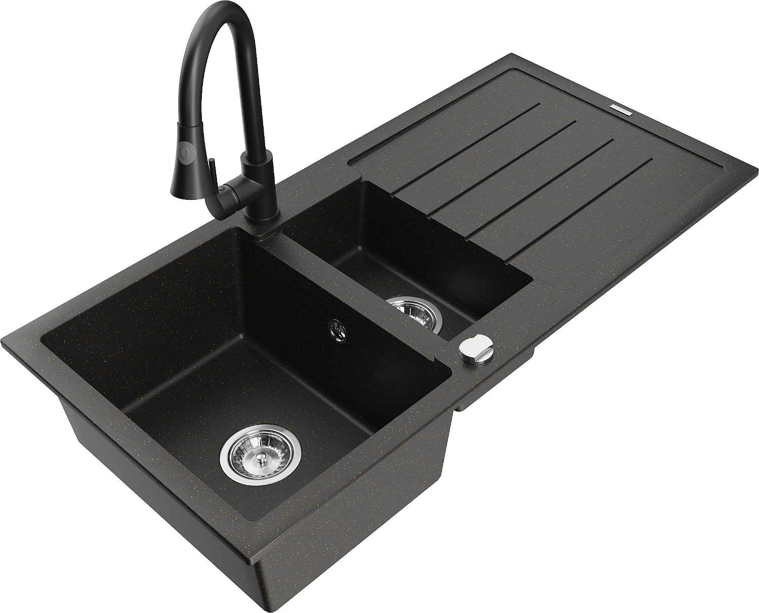 Mexen Andres granitový dřez 1,5-komorový s odkapávačem a kuchyňskou baterií Elia, černý/zlatý metalik - 6515-75-670101-70