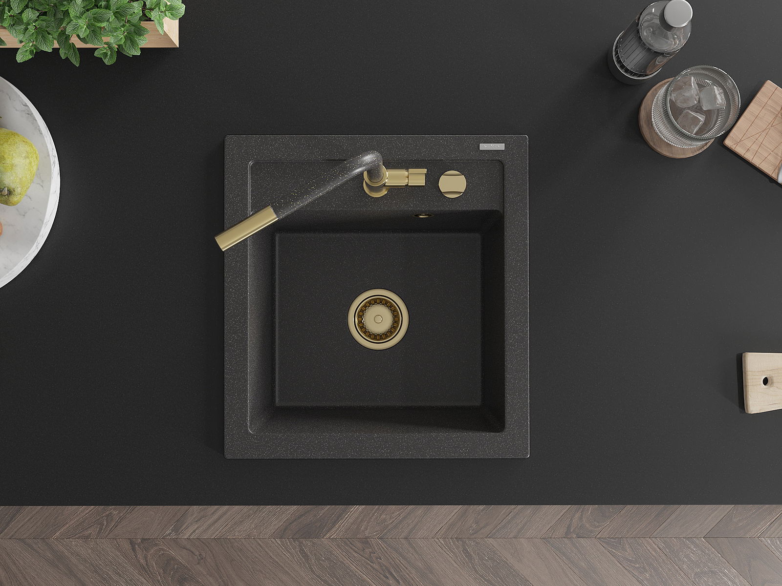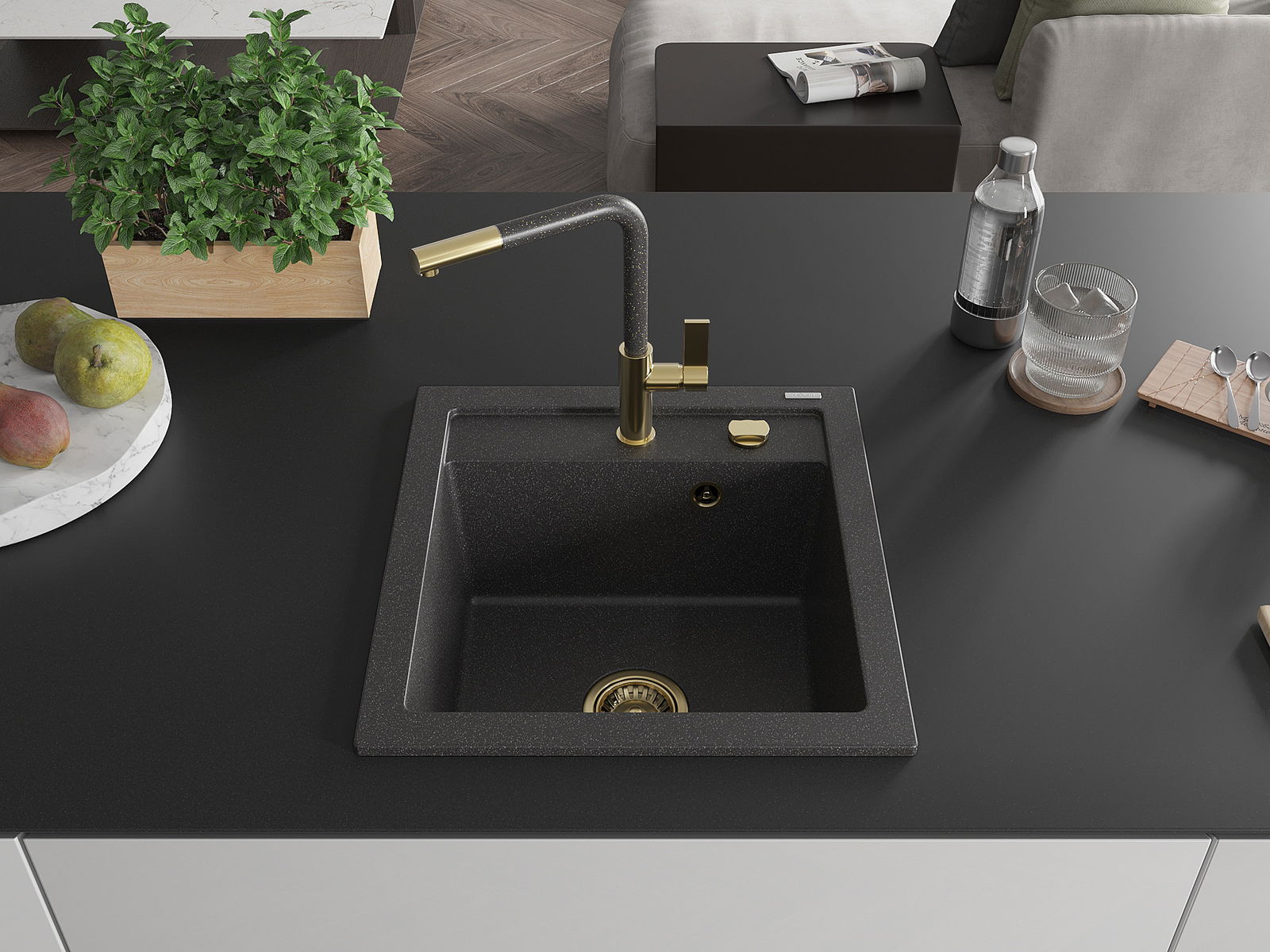 Mexen Vito granitový dřez 1-komorový s kuchyňskou baterií Flora, černý kropenatý - 6503-76-670401-75-G