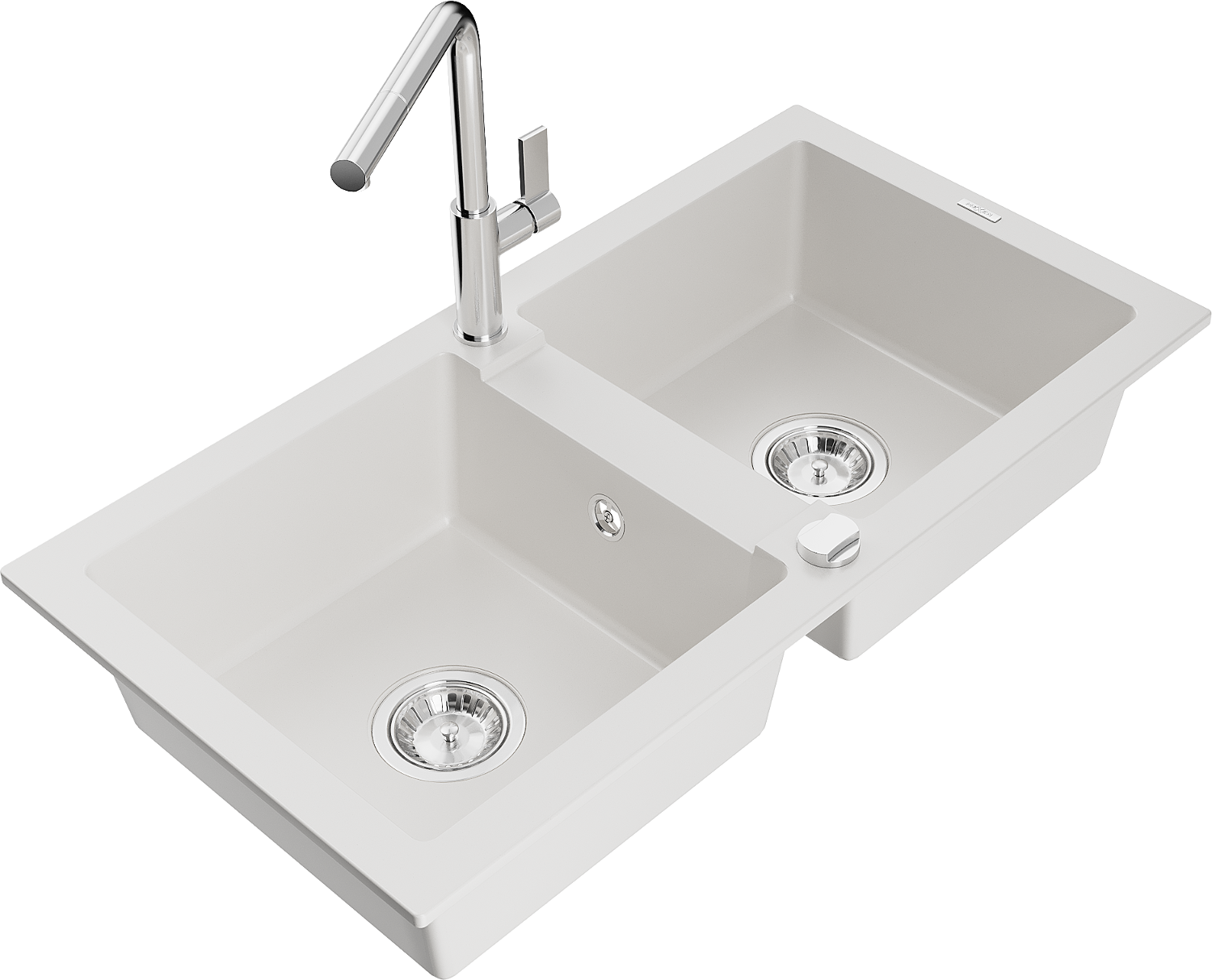 Mexen Mario žulový dřez dvojkomorový s kuchyňskou baterií Flora, bílý - 6504-20-670401-00