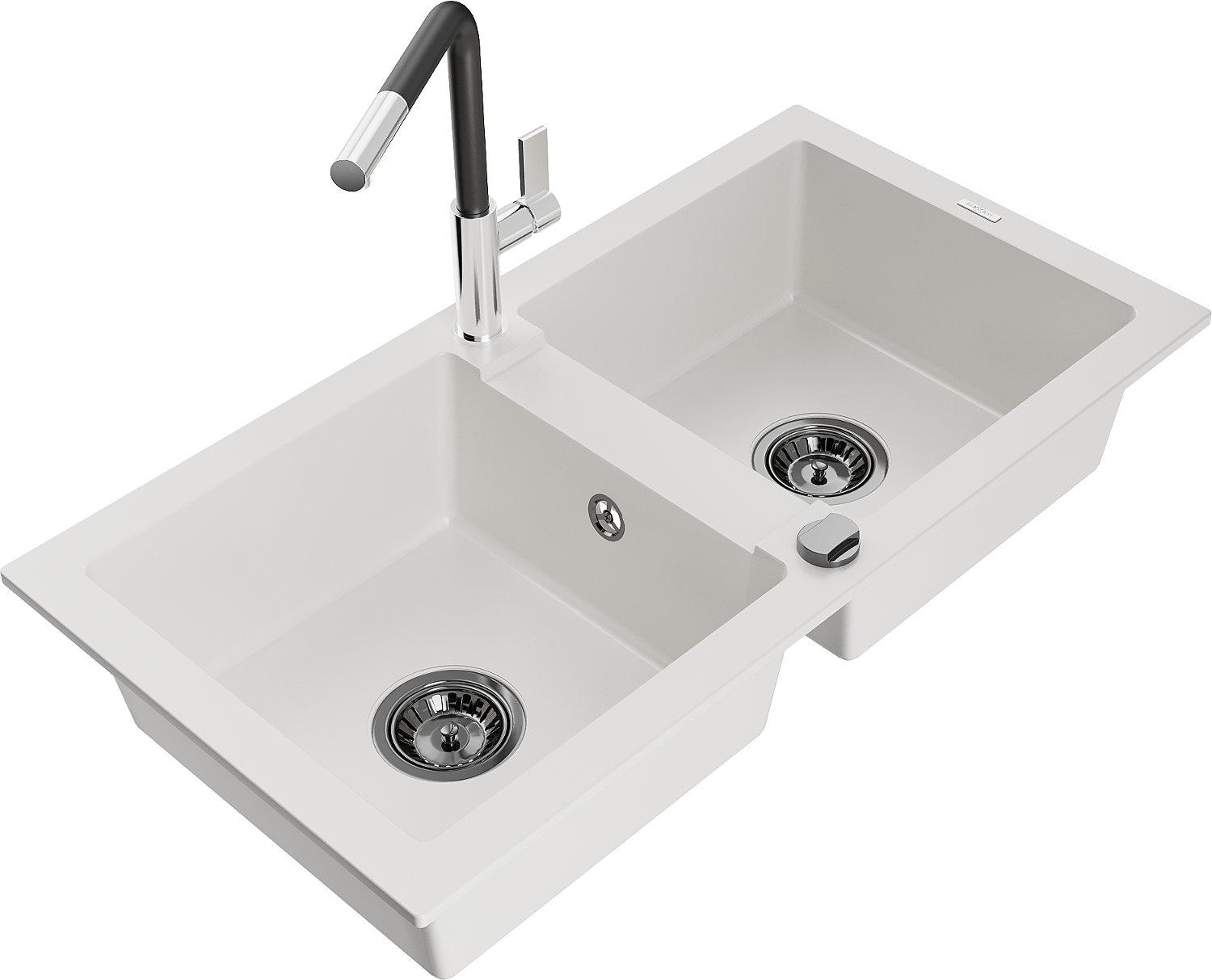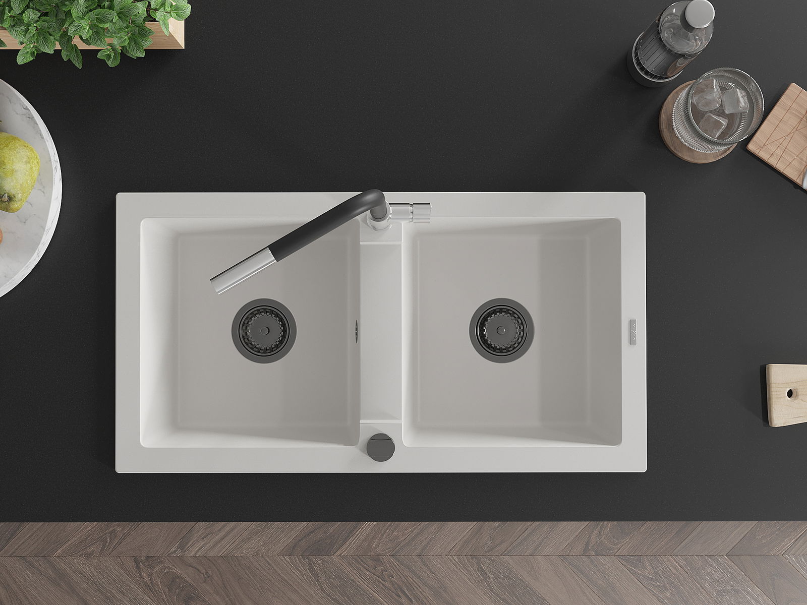 Mexen Mario žulový dřez 2-komorový s kuchyňskou baterií Flora, bílý - 6504-20-670401-07-B