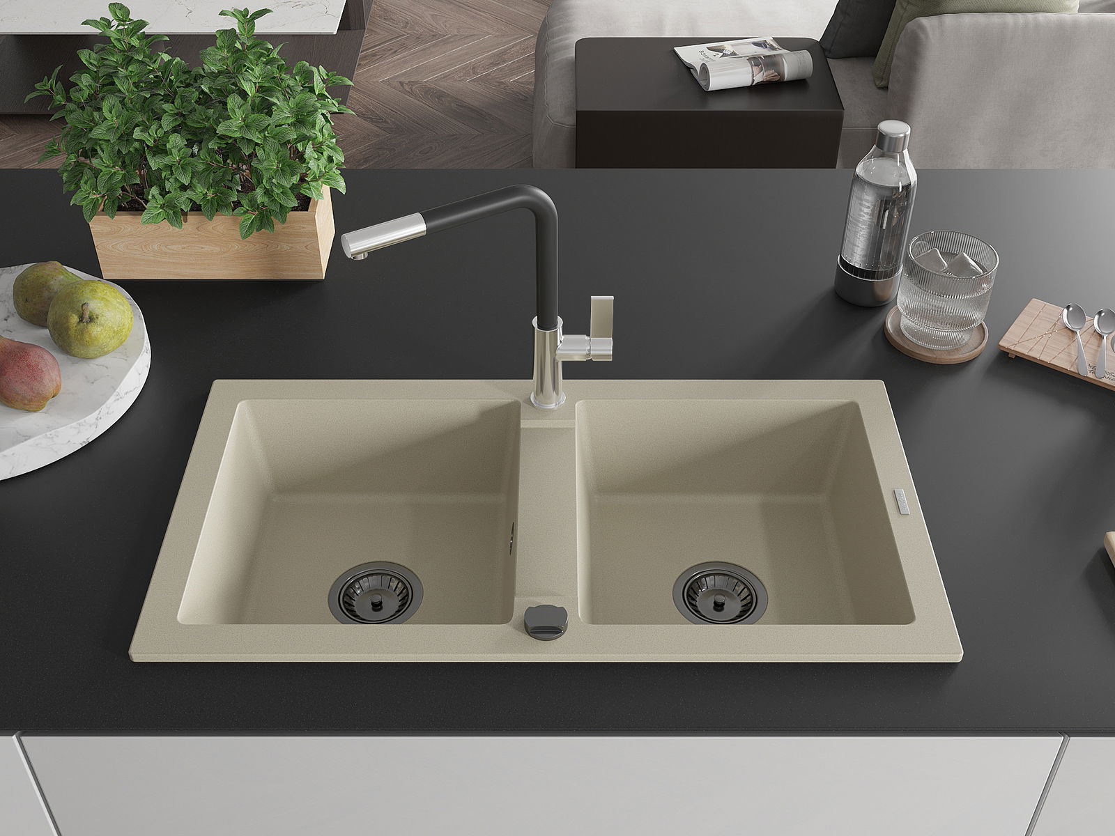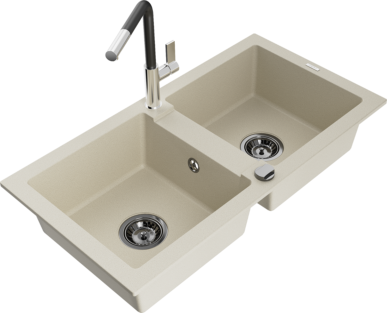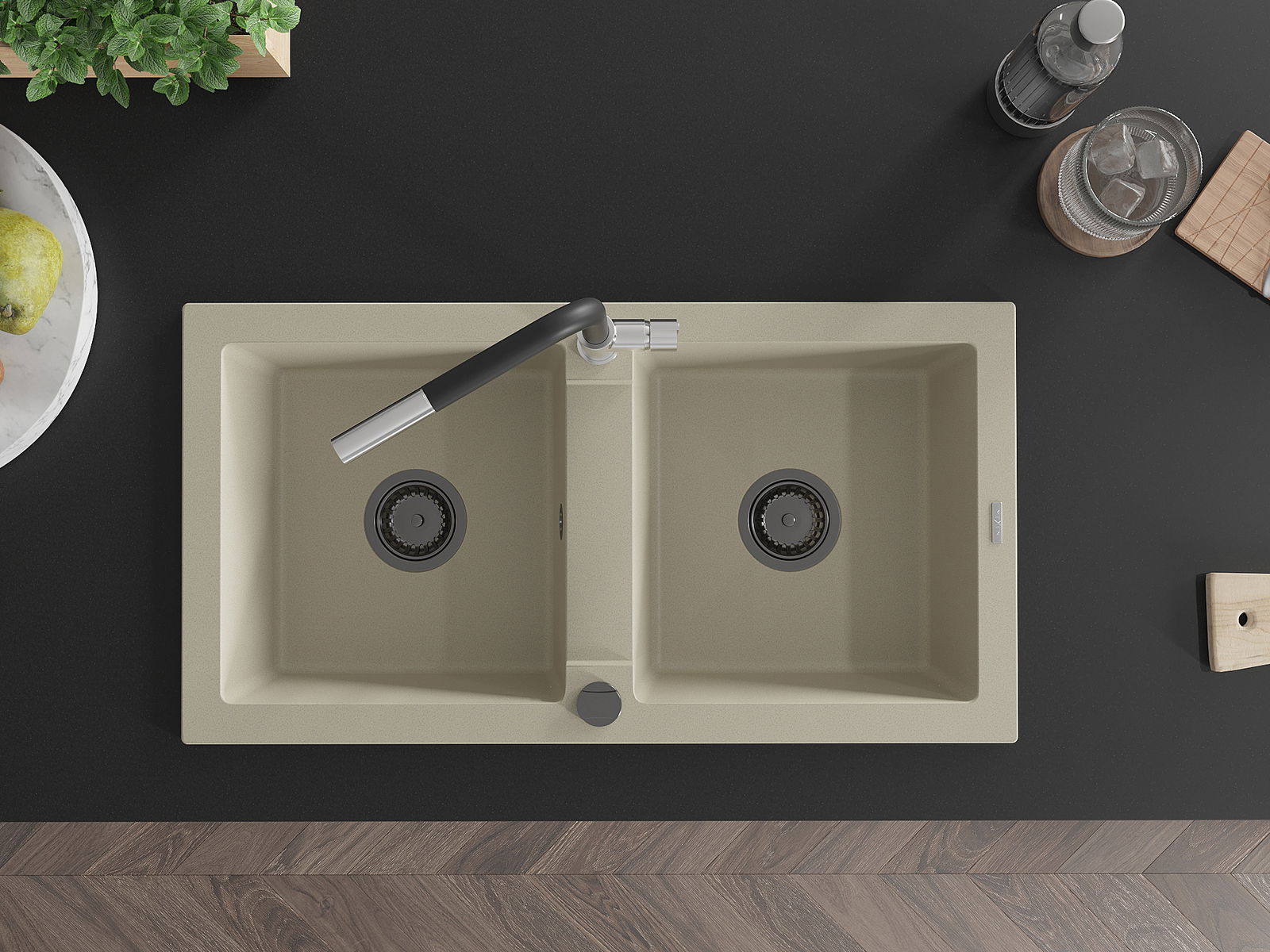 Mexen Mario dřez granitový 2-komorový s kuchyňskou baterií Flora, béžový - 6504-69-670401-07-B