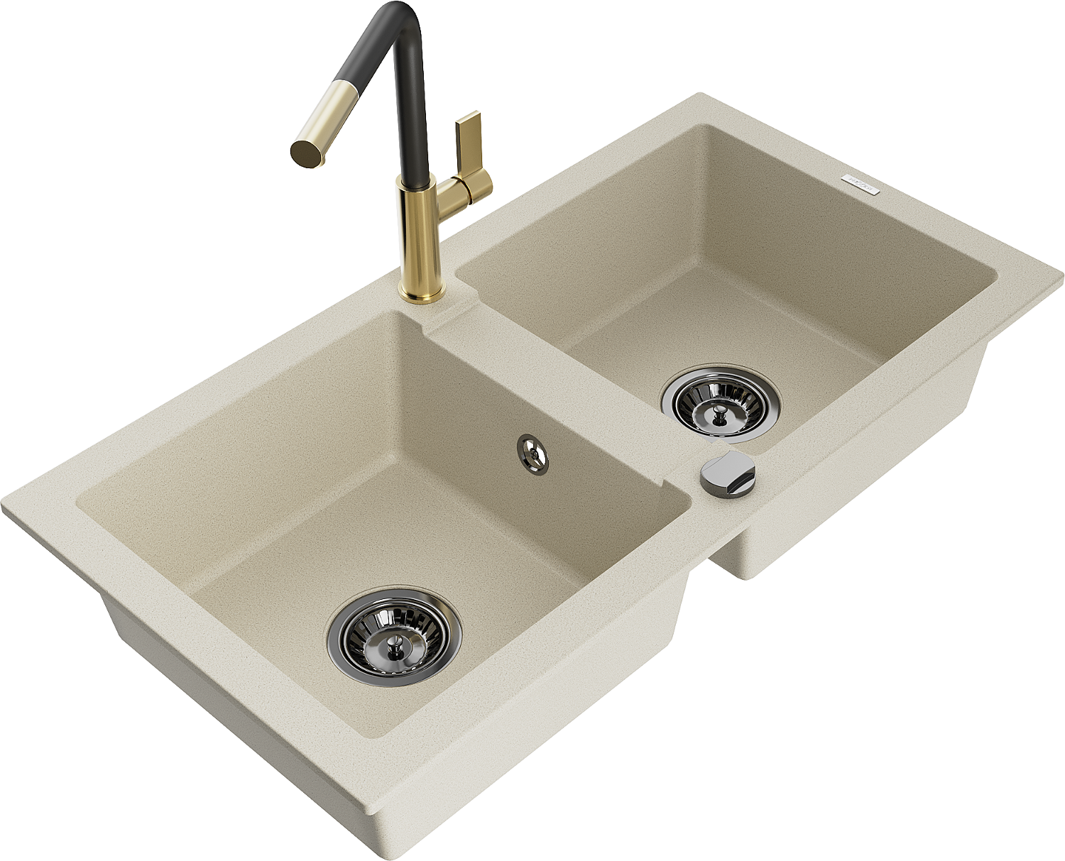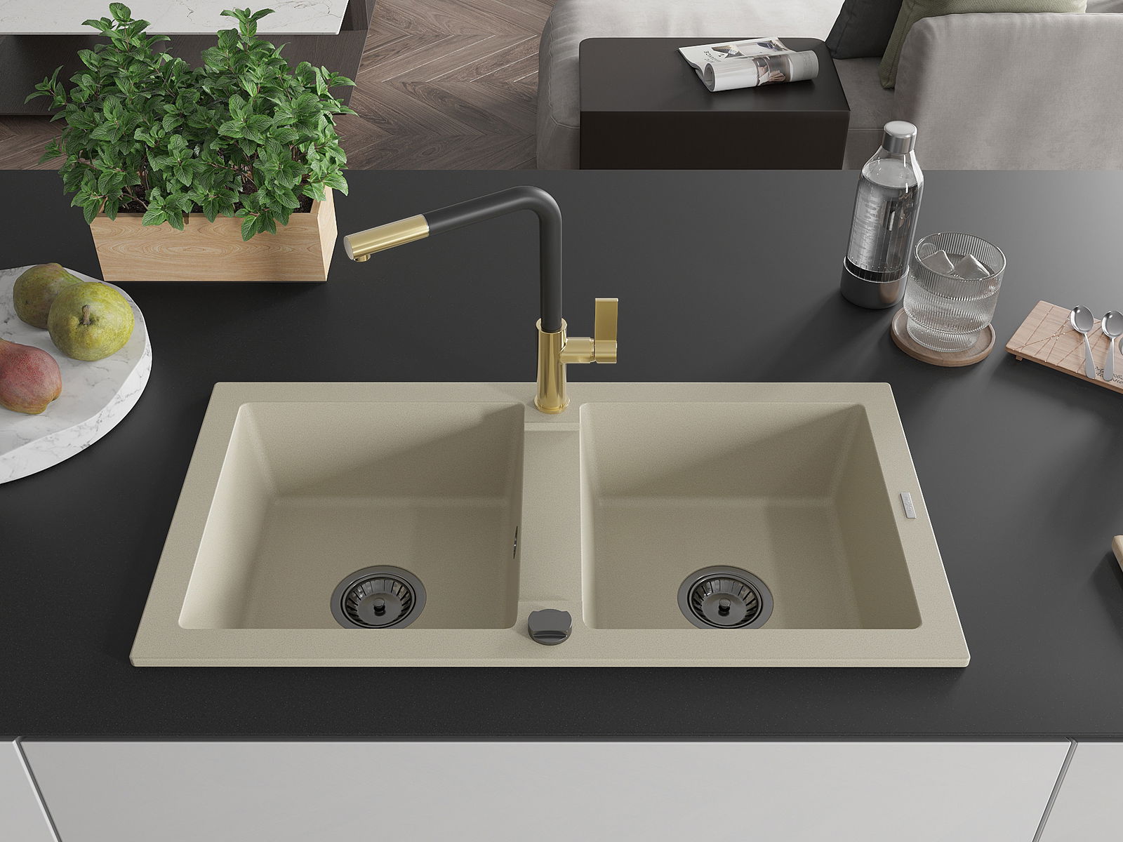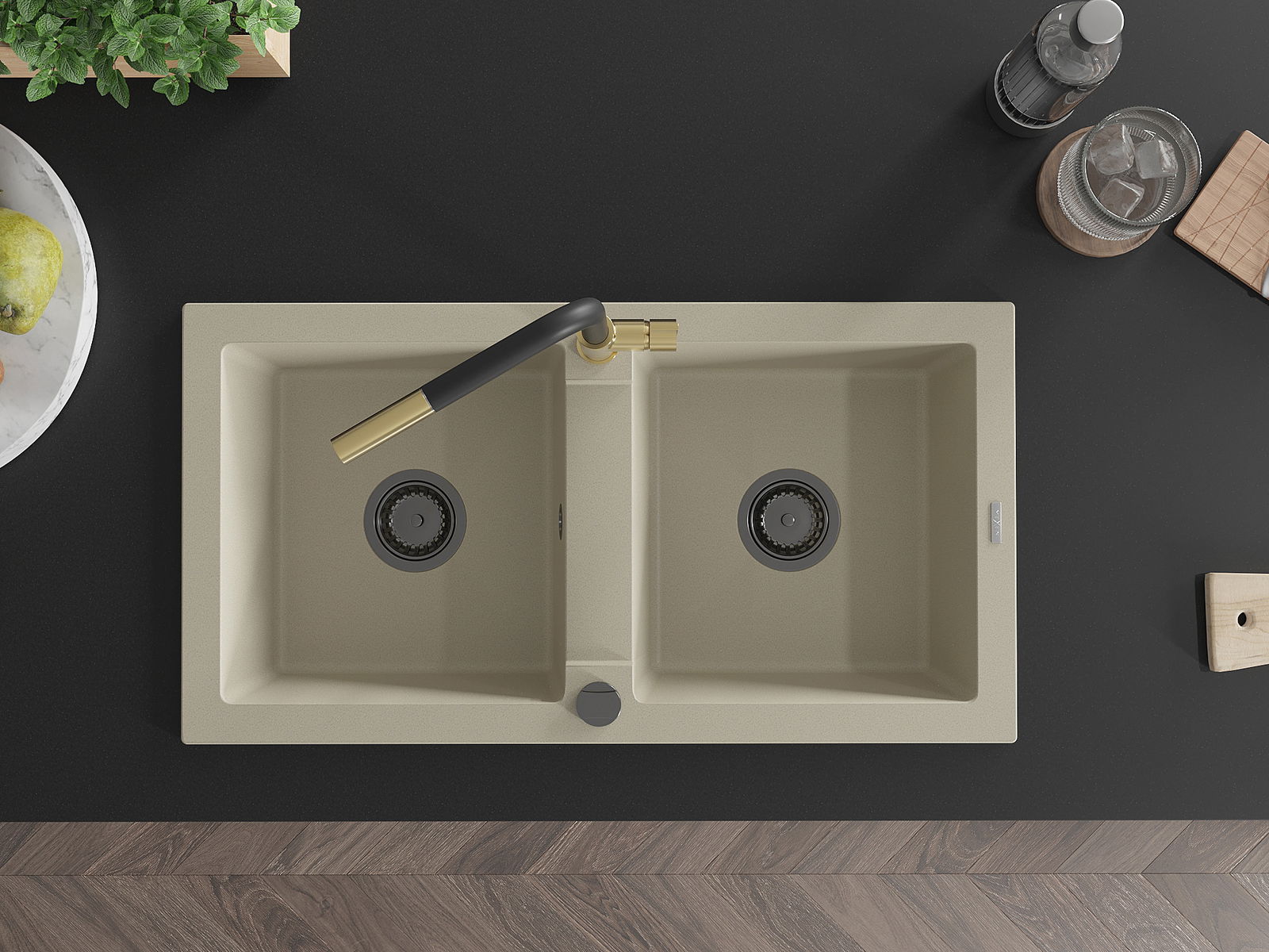 Mexen Mario dřez granitový 2-komorový s kuchyňskou baterií Flora, béžový - 6504-69-670401-57-B