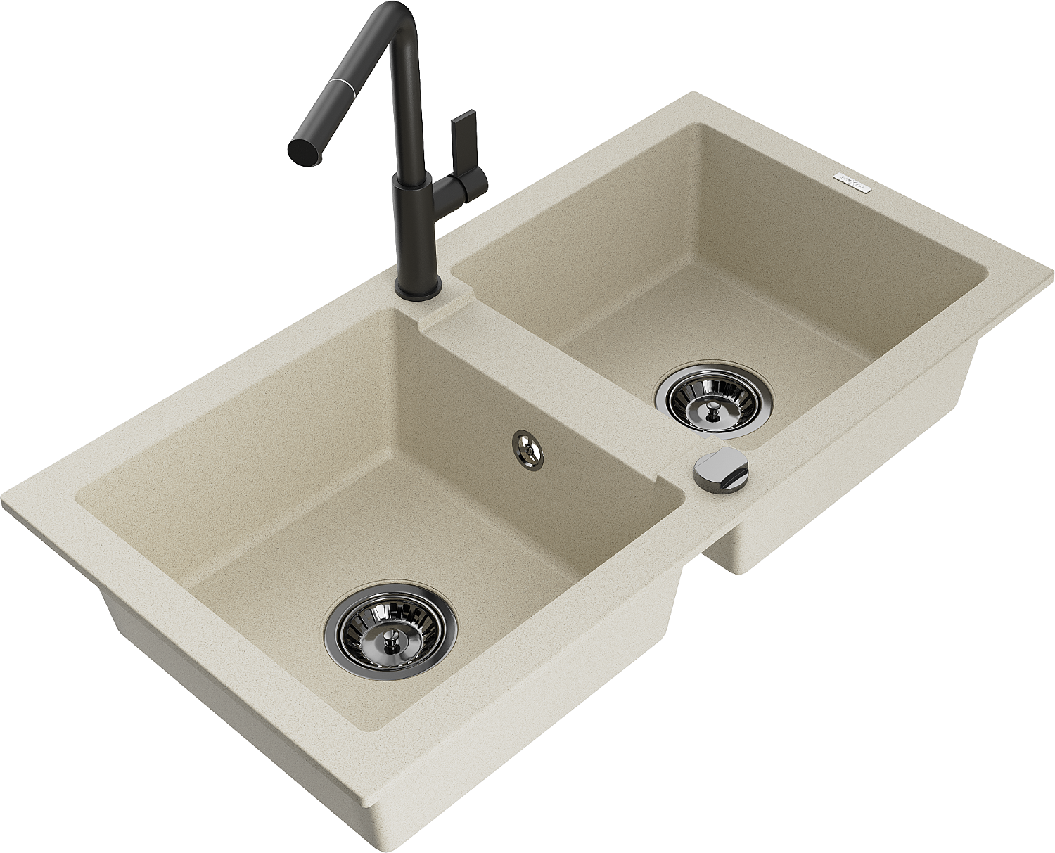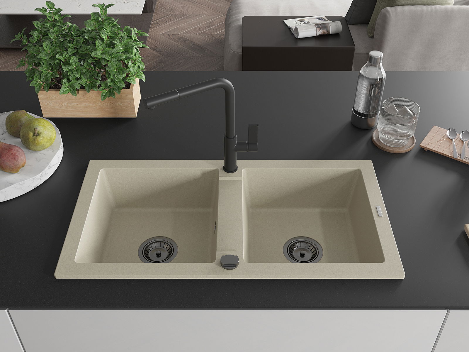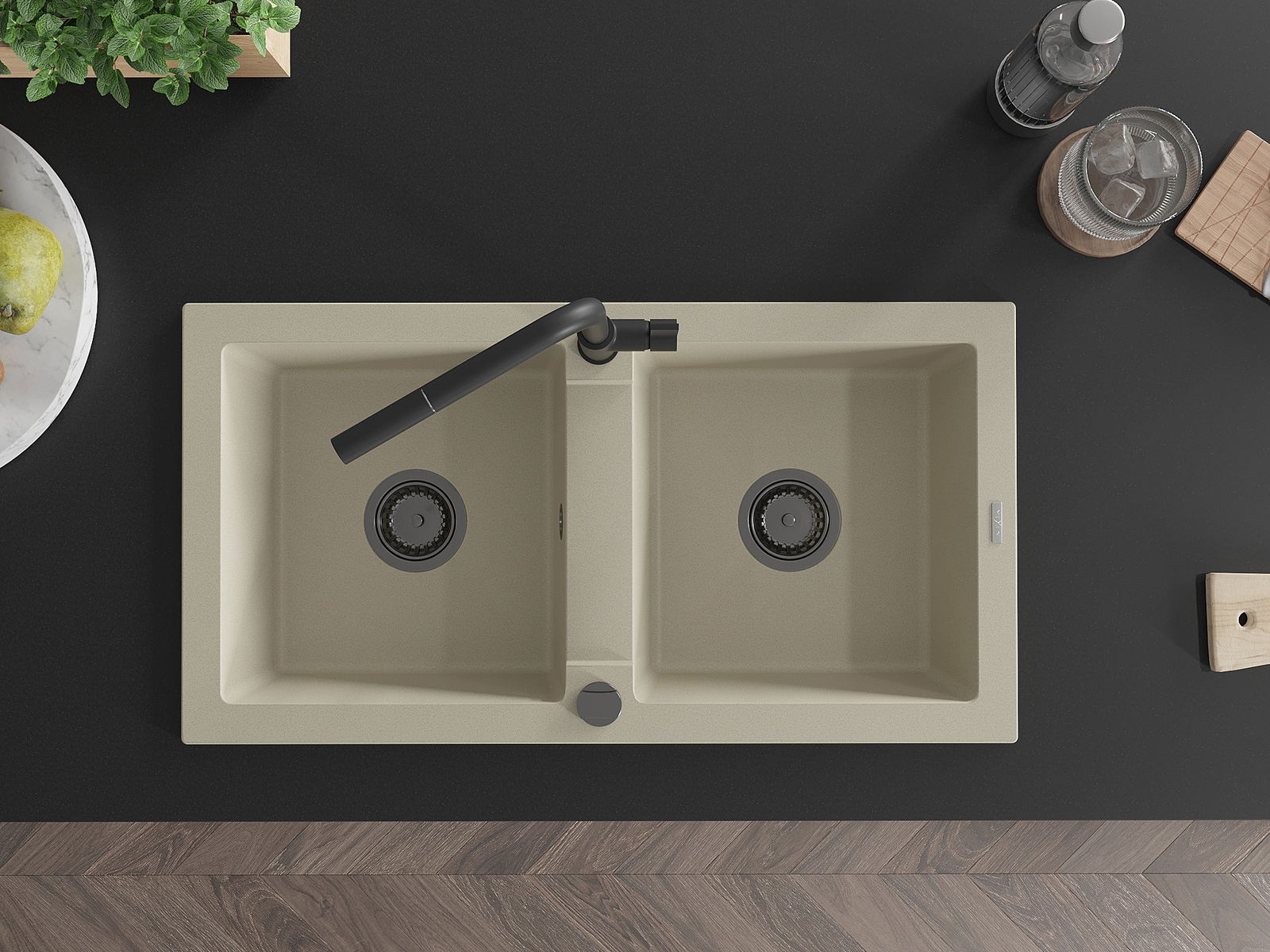 Mexen Mario dvoukomorový žulový dřez s kuchyňskou baterií Flora, béžový - 6504-69-670401-70-B