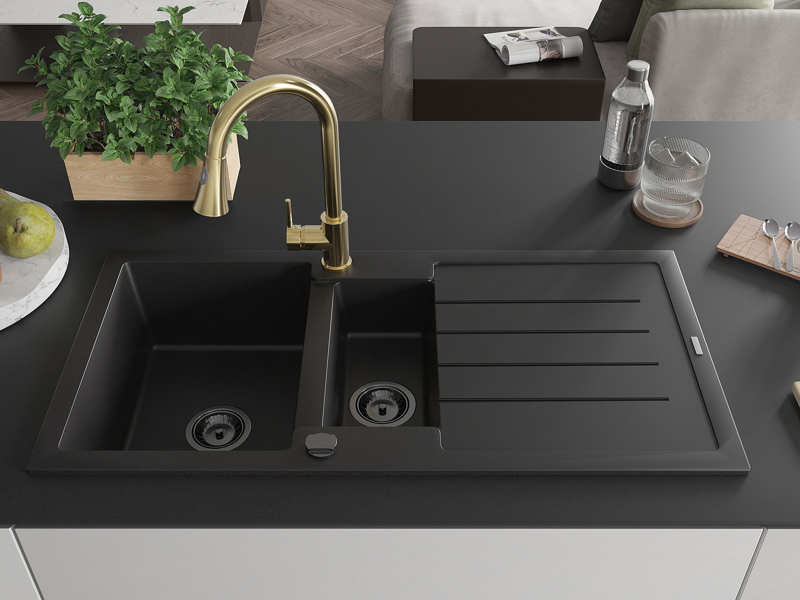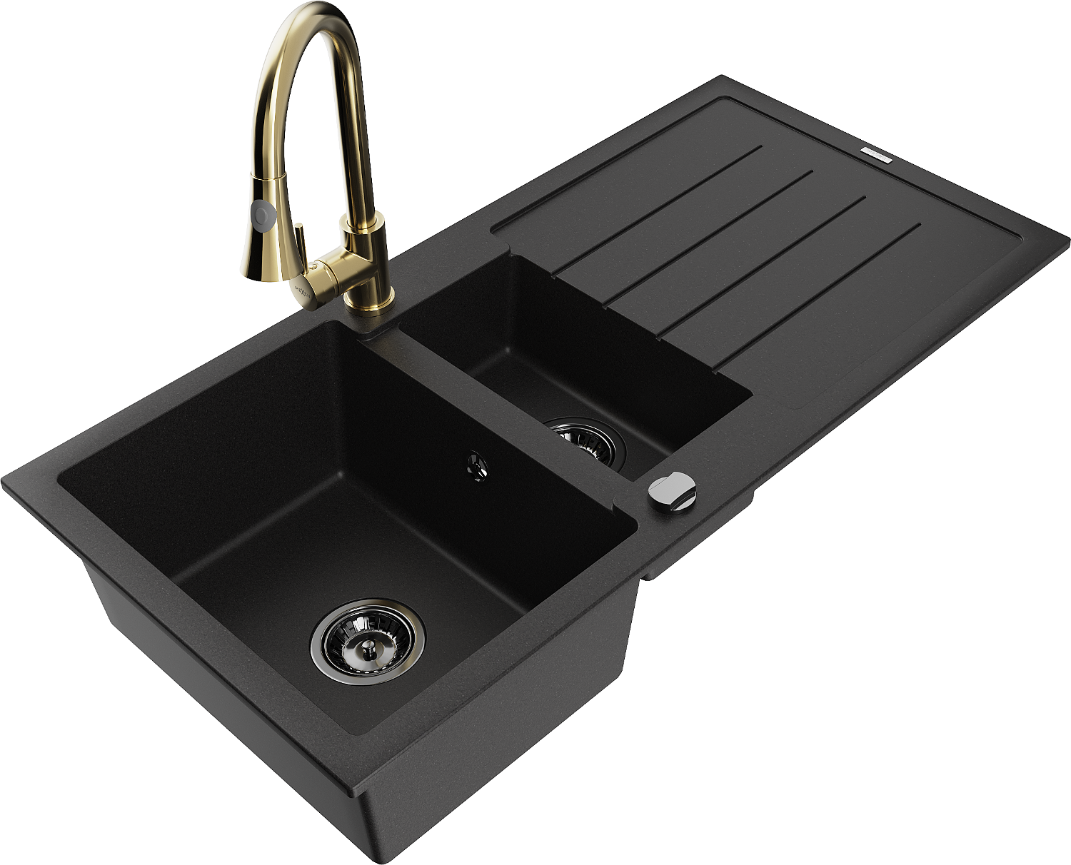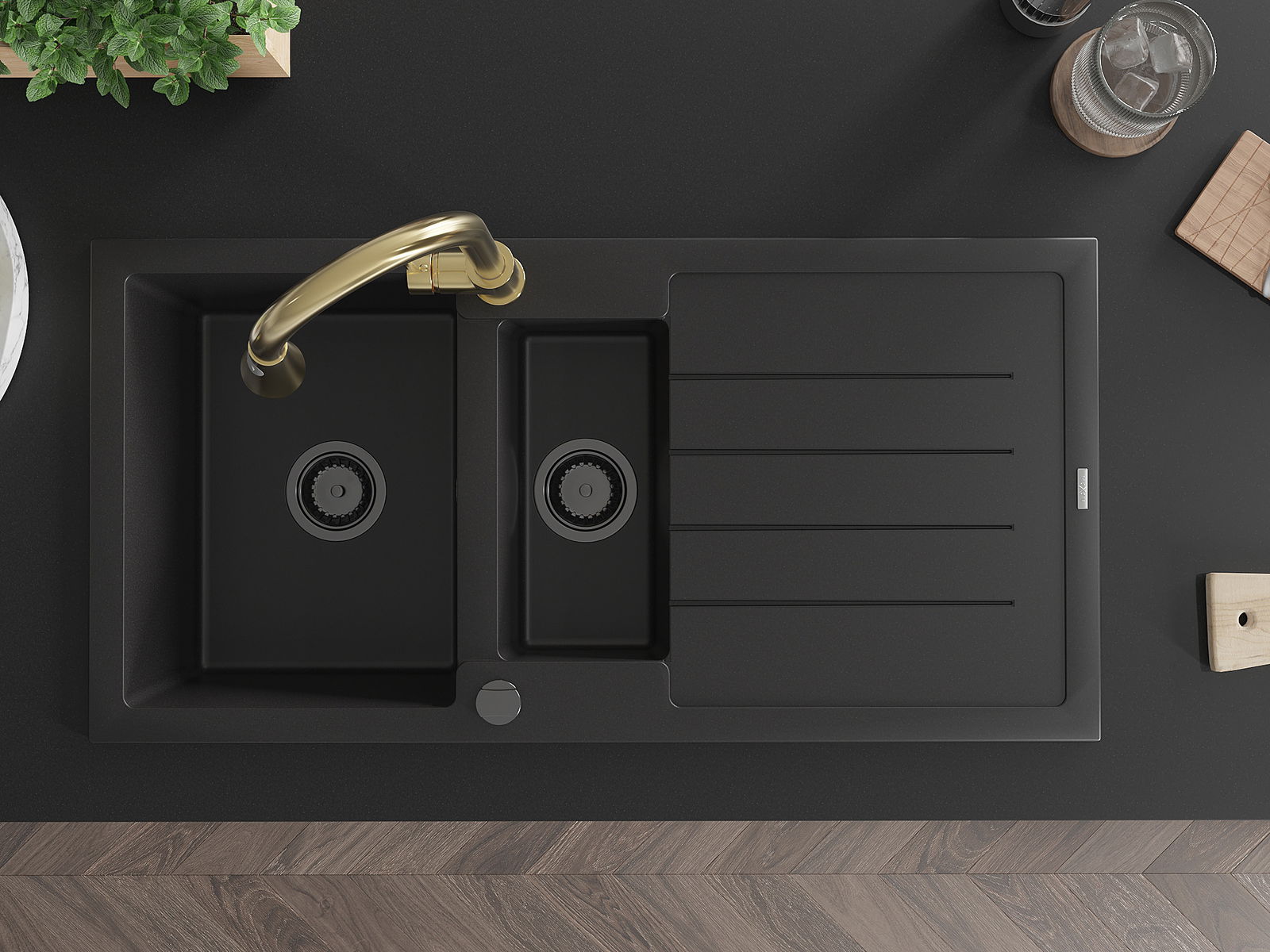 Mexen Andres granitový dřez 1,5-komorový s odkapávačem a kuchyňskou baterií Elia, černý - 6515-77-670101-50-B