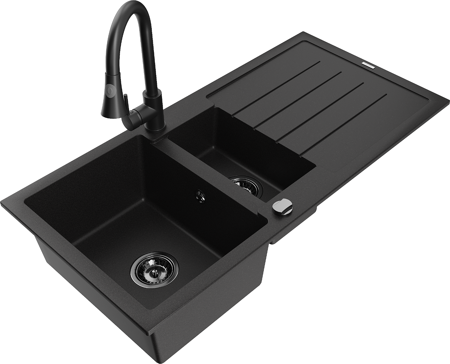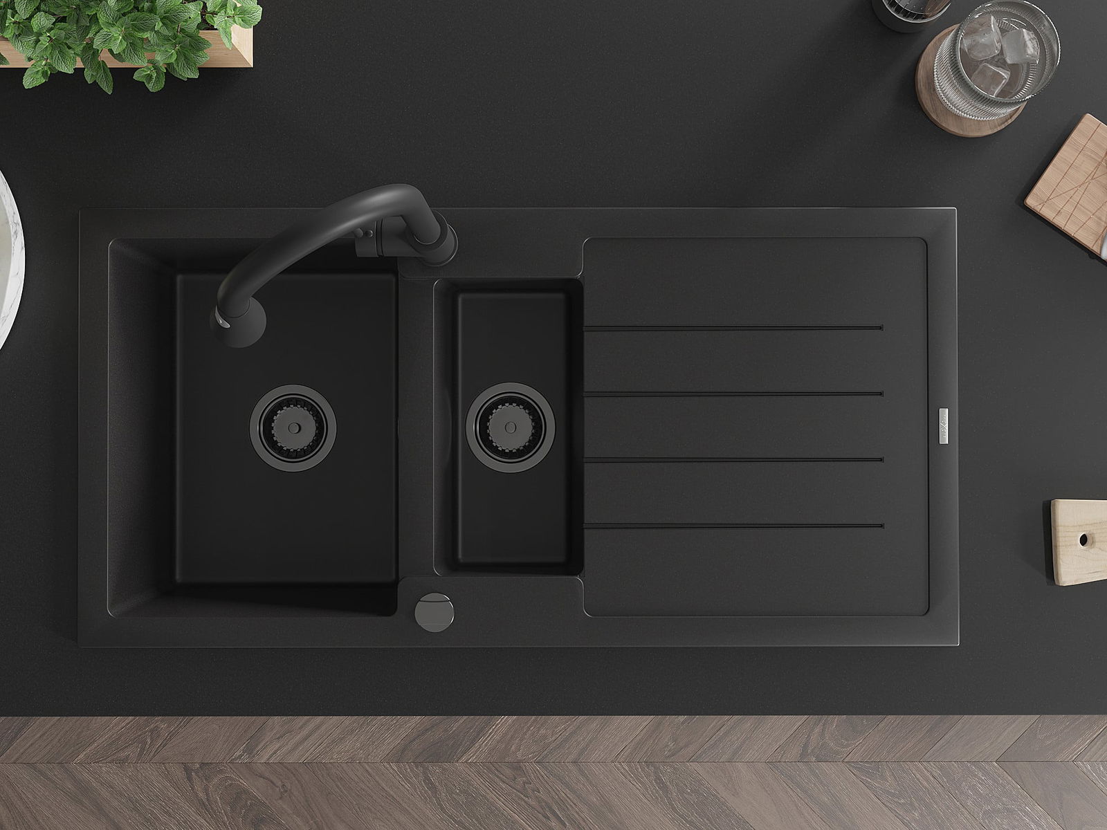 Mexen Andres žulový dřez 1,5-komorový s odkapávačem a kuchyňskou baterií Elia, černý - 6515-77-670101-70-B