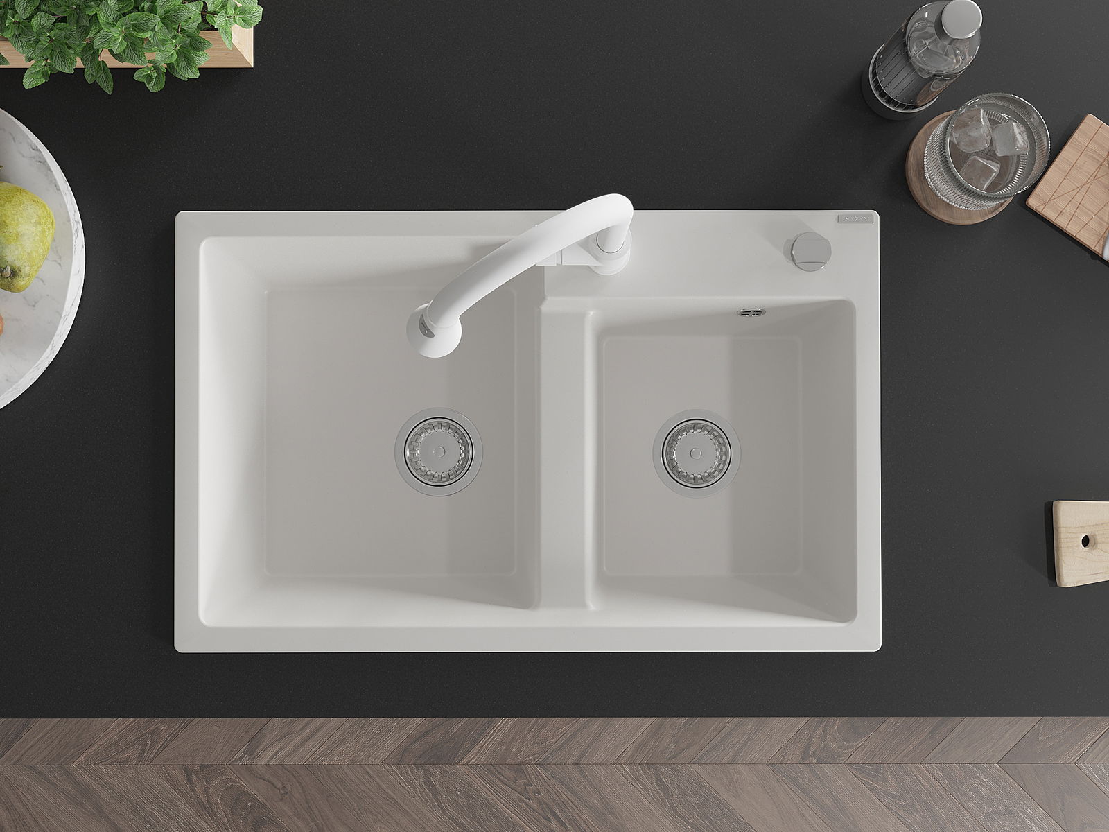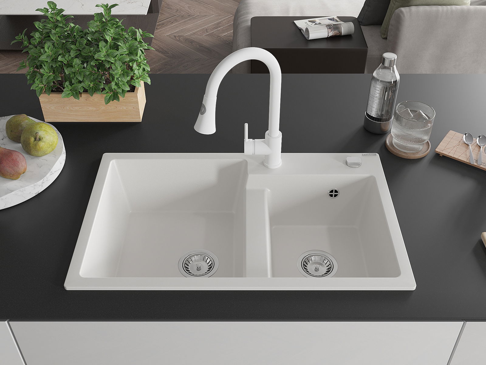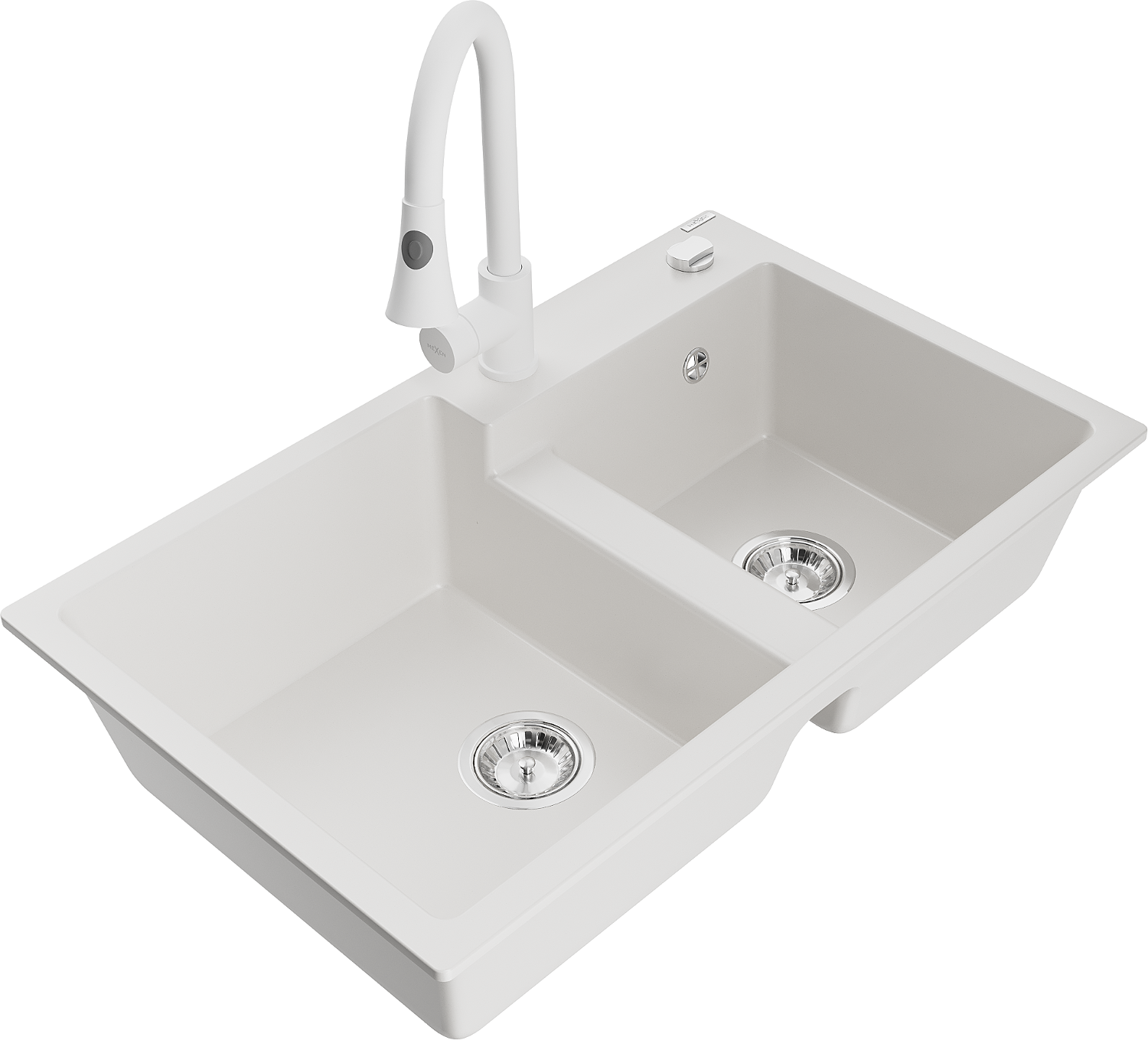 Mexen Tomas granitový dřez dvoukomorový s kuchyňskou baterií Elia, bílý - 6516-20-670101-20