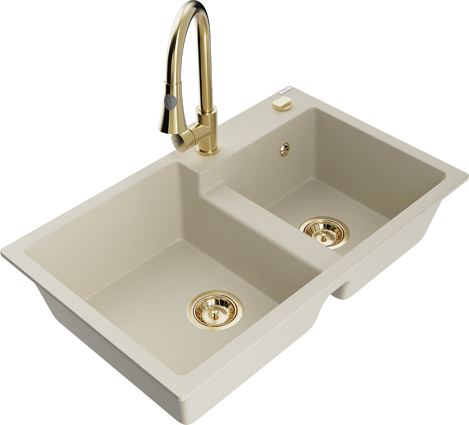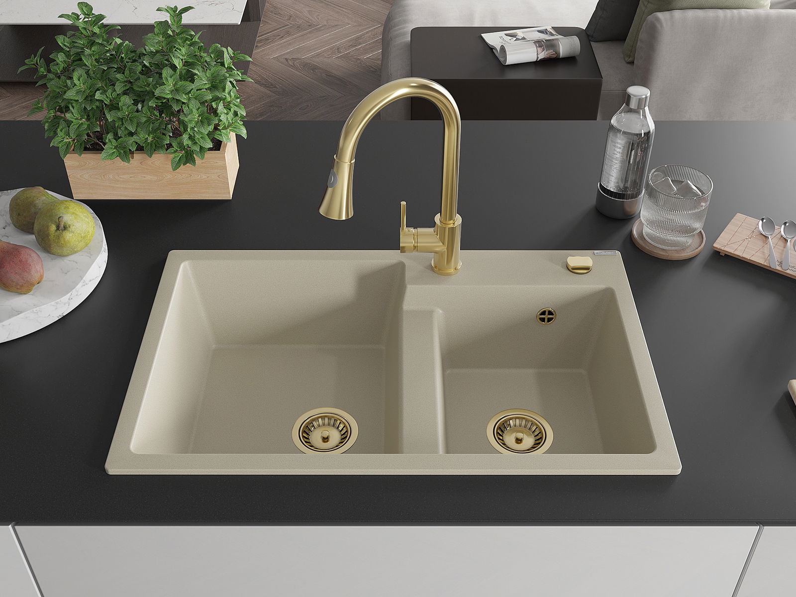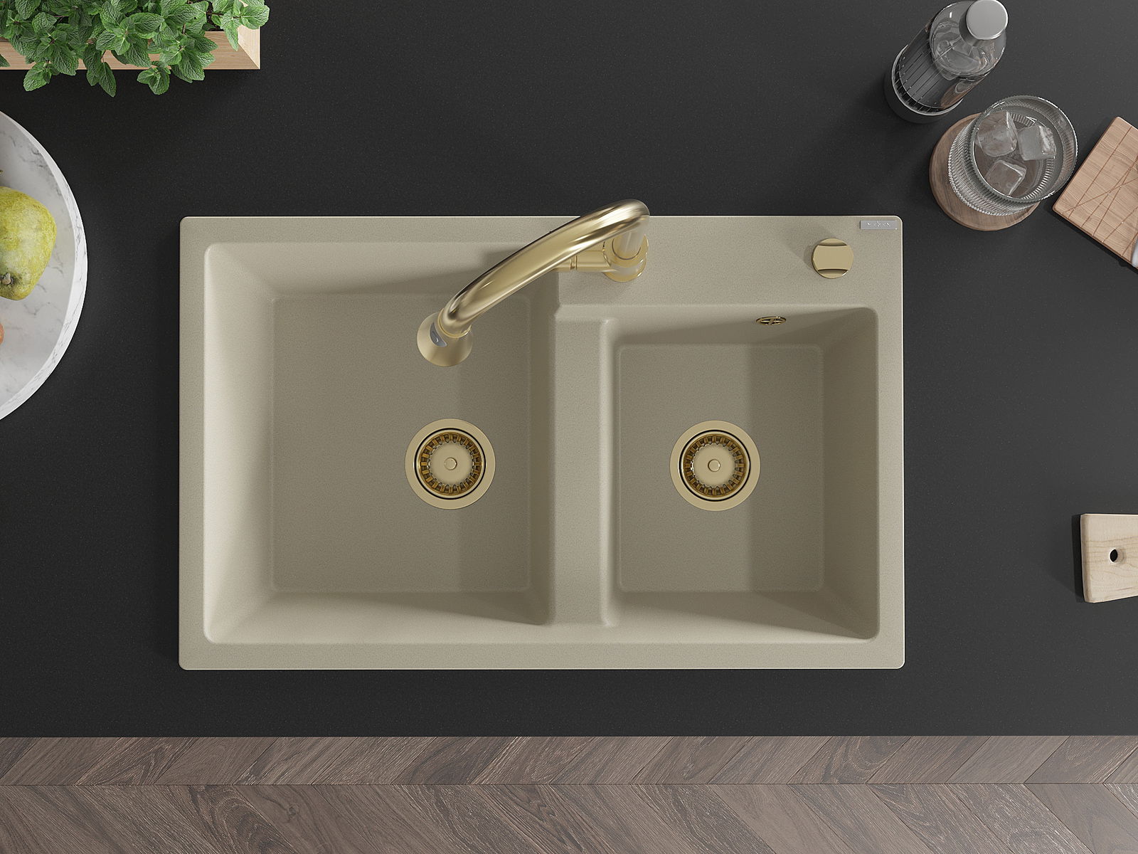 Mexen Tomas dvoukomorový granitový dřez s kuchyňskou baterií Elia, béžový - 6516-69-670101-50
