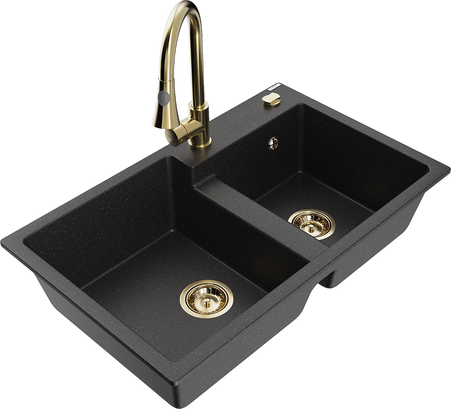 Mexen Tomas granitový dřez 2-komorový s kuchyňskou baterií Elia, černý/stříbrný metalik - 6516-73-670101-50