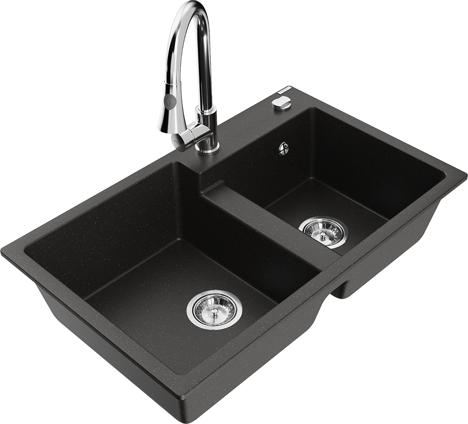 Mexen Tomas granitový dřez 2-komorový s kuchyňskou baterií Elia, černý/zlatý metalík - 6516-75-670101-00