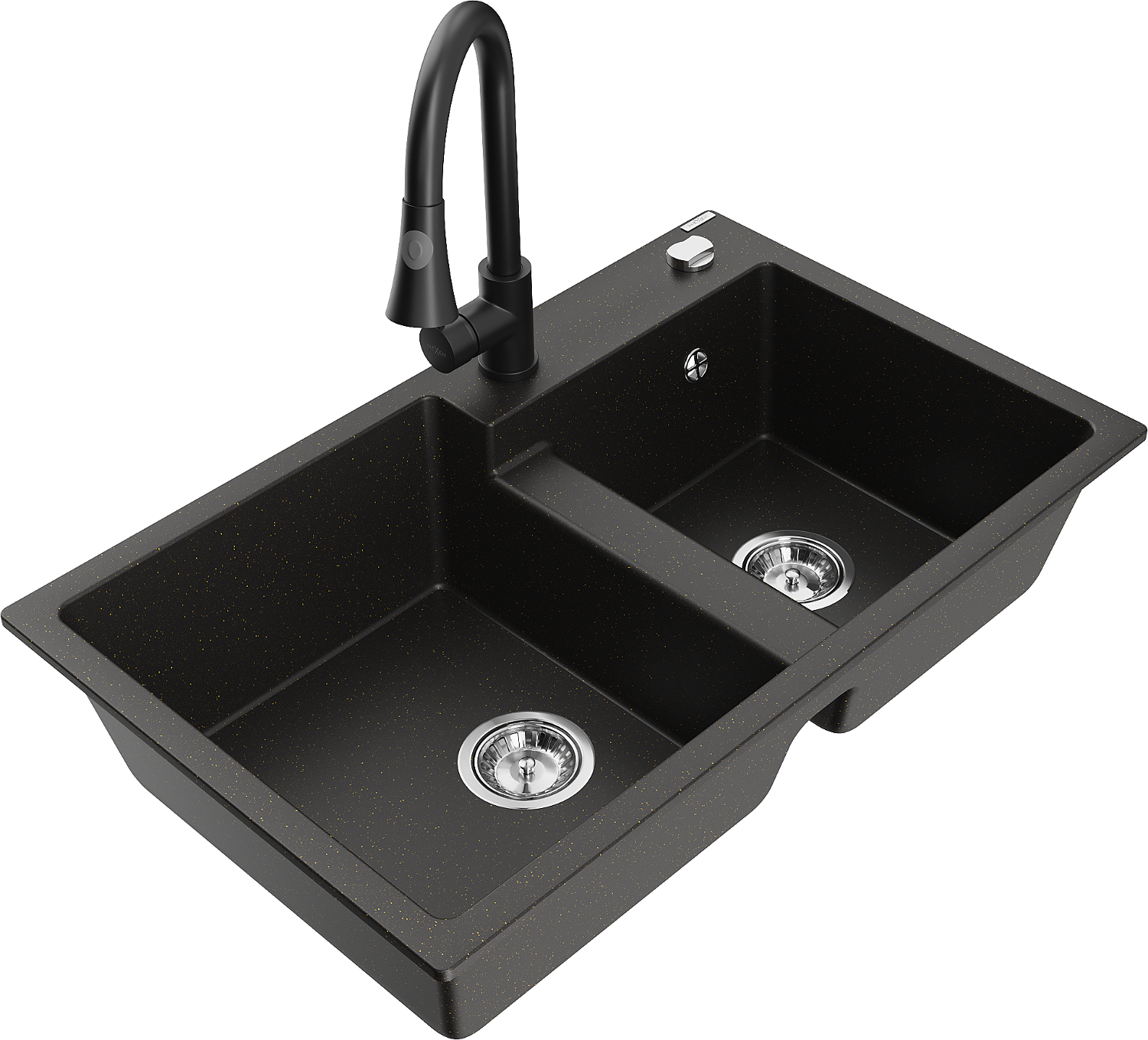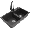 Mexen Tomas žulový dřez s 2 komorami a kuchyňskou baterií Elia, černý/zlatý metalický - 6516-75-670101-70