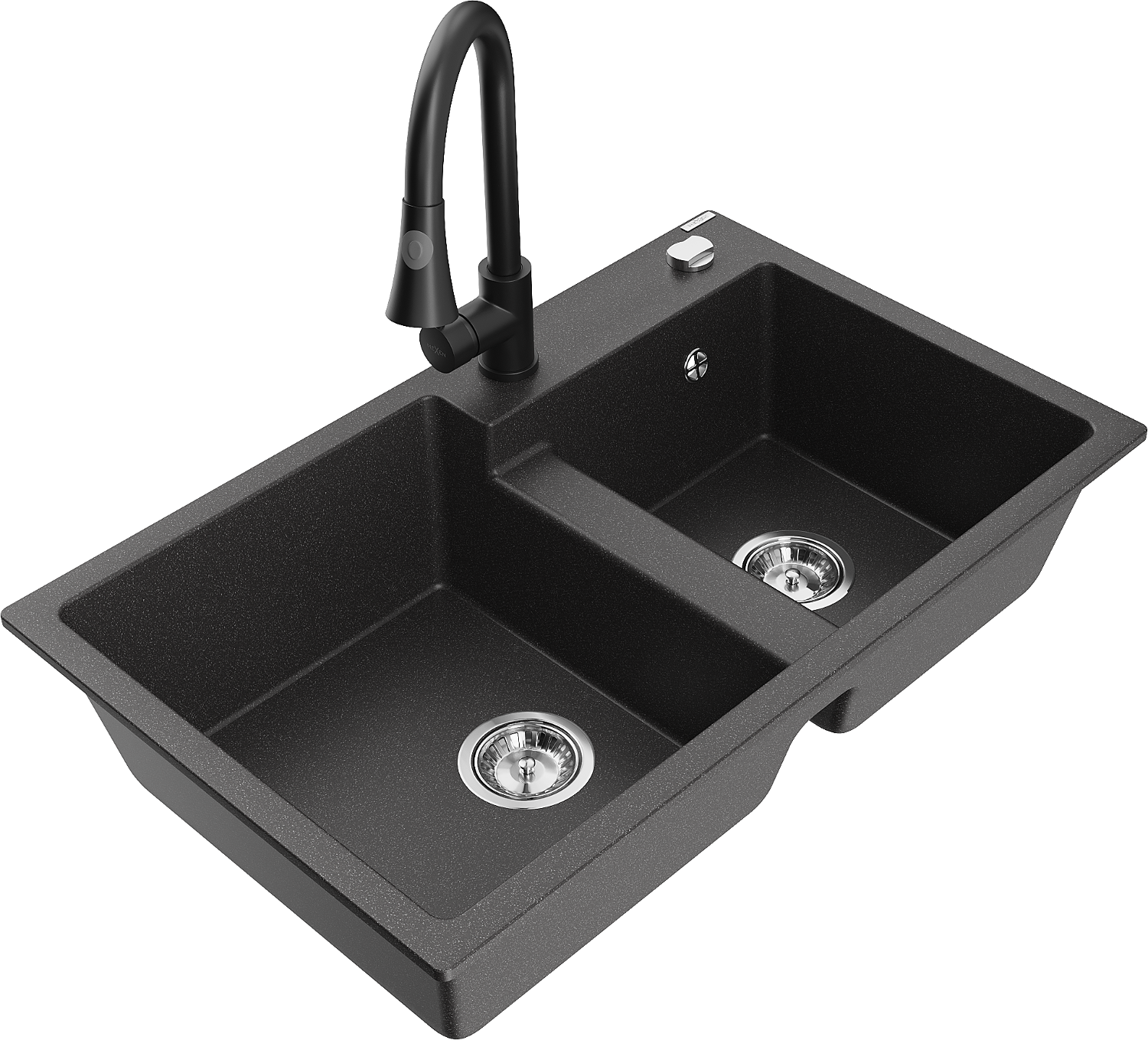 Mexen Tomas dřez žulový 2-komorový s kuchyňskou baterií Elia, černý puntíkovaný - 6516-76-670101-70