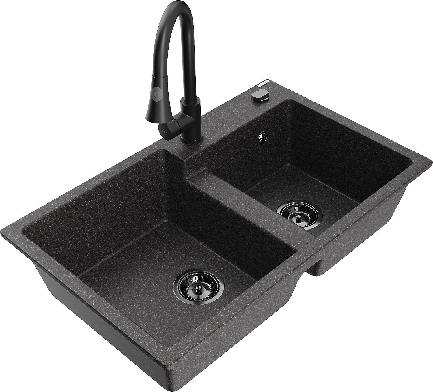 Mexen Tomas granitový dřez 2-komorový s kuchyňskou baterií Elia, černý skvrnitý - 6516-76-670101-70-B