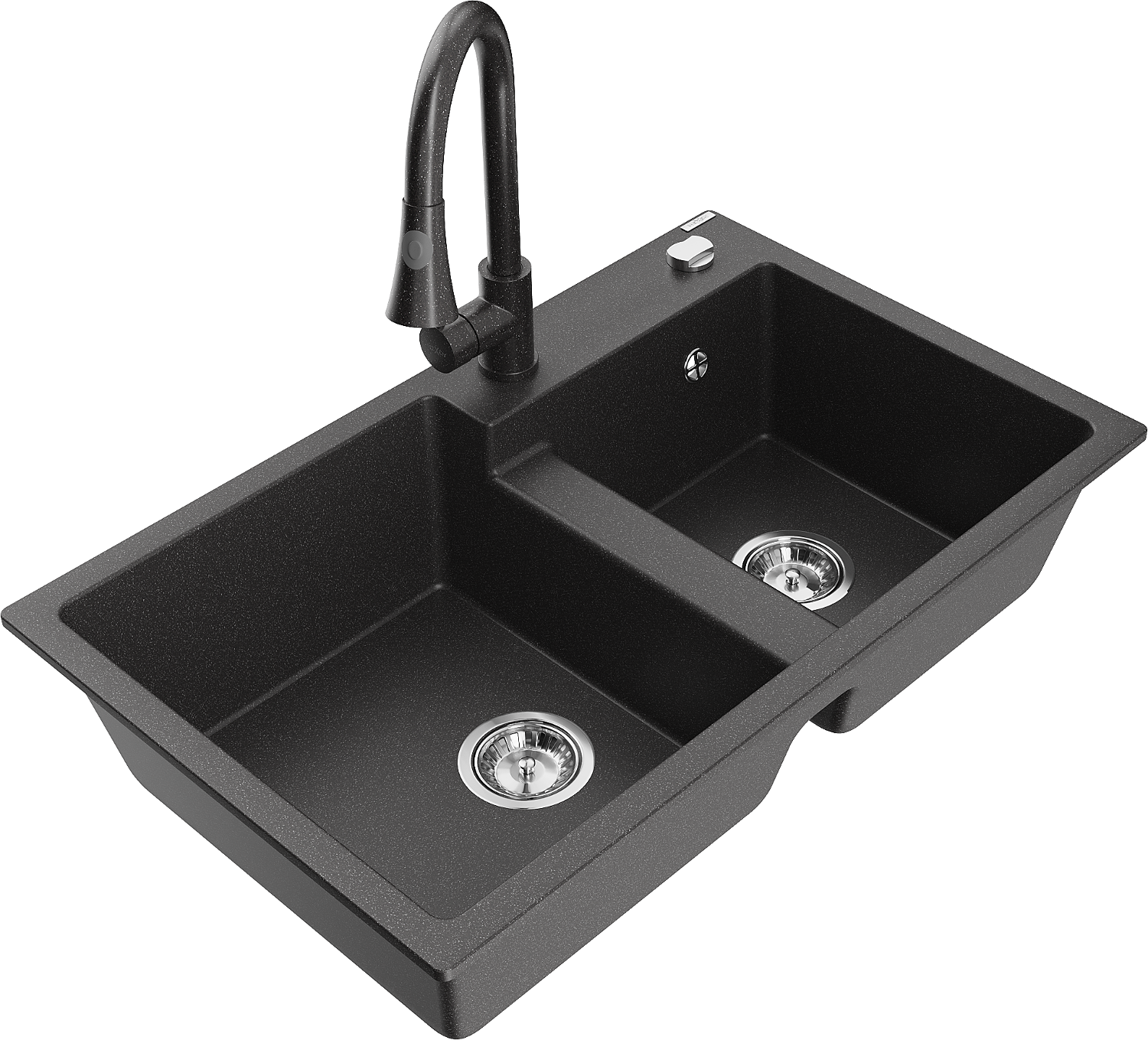 Mexen Tomas žulový dřez se 2 komorami s kuchyňskou vodovodní baterií Elia, černý tečkovaný - 6516-76-670101-76