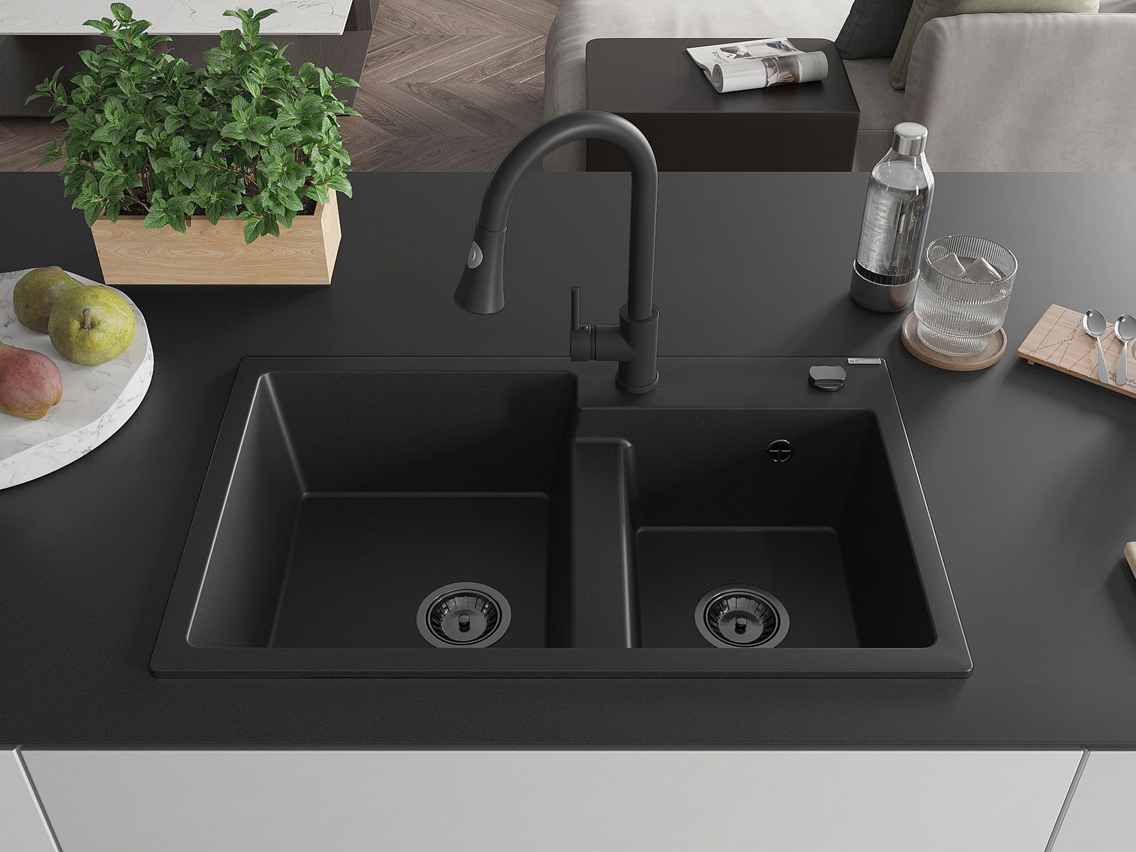 Mexen Tomas dřez granitový 2-komorový s kuchyňskou baterií Elia, černý - 6516-77-670101-70-B
