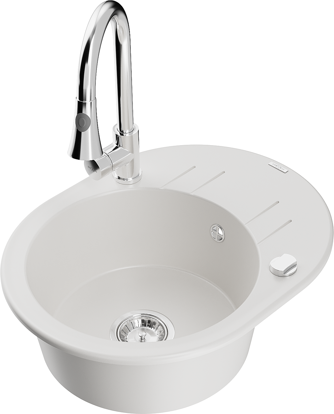 Mexen Kevin granitový dřez 1-komorový s odkapávačem a kuchyňskou baterií Elia, bílý - 6517-20-670101-00