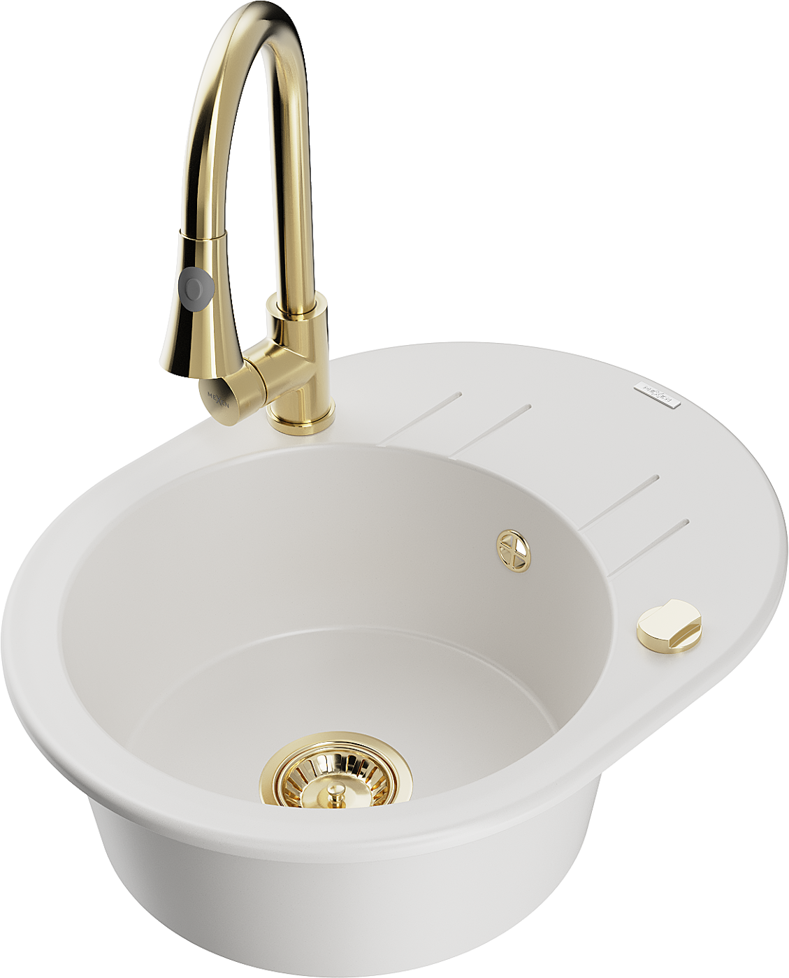 Mexen Kevin granitový dřez 1-komorový s odkapávačem a kuchyňskou baterií Elia, bílý - 6517-20-670101-50