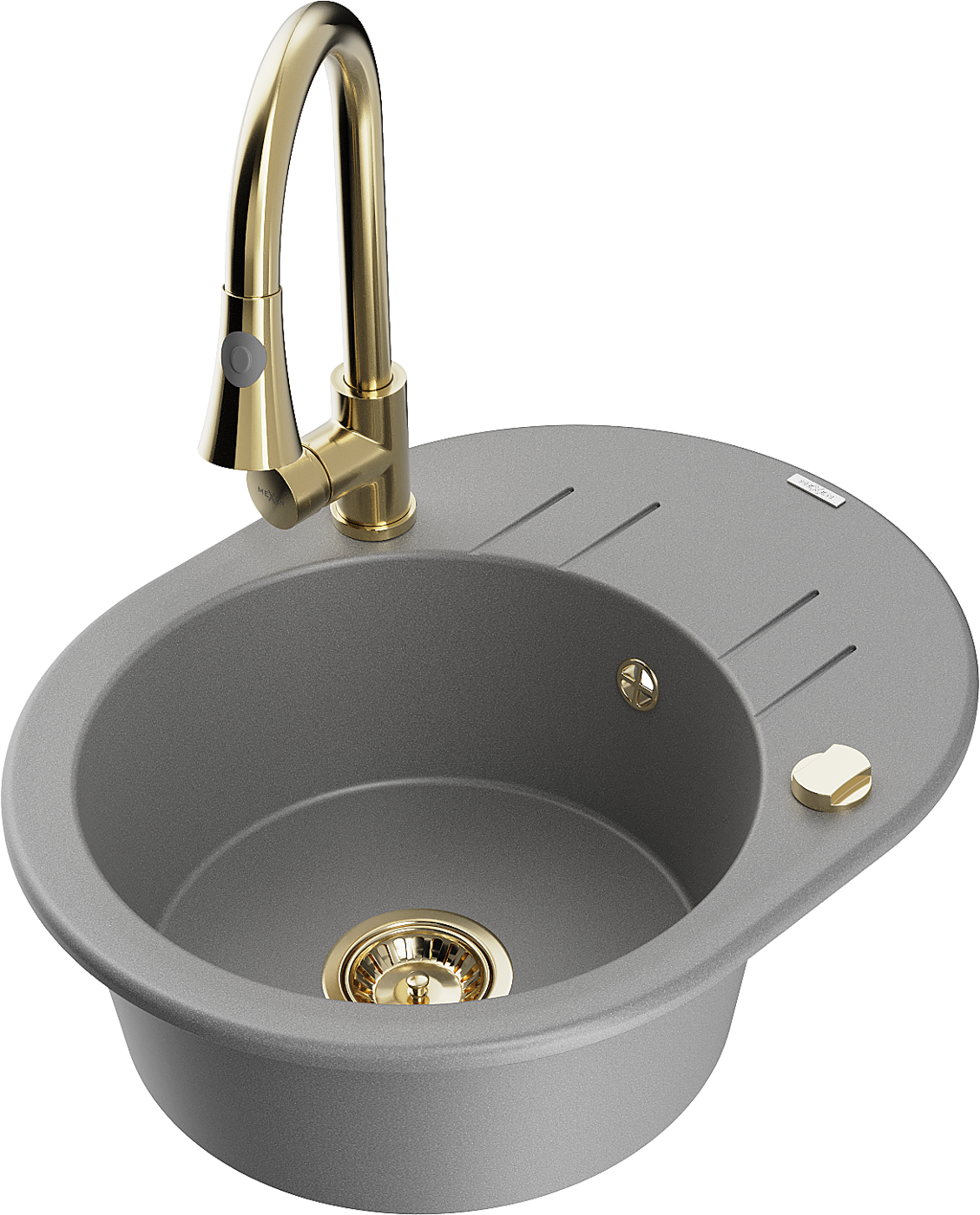 Mexen Kevin granitový dřez 1-komorový s odkapávačem a kuchyňskou baterií Elia, šedý - 6517-71-670101-50