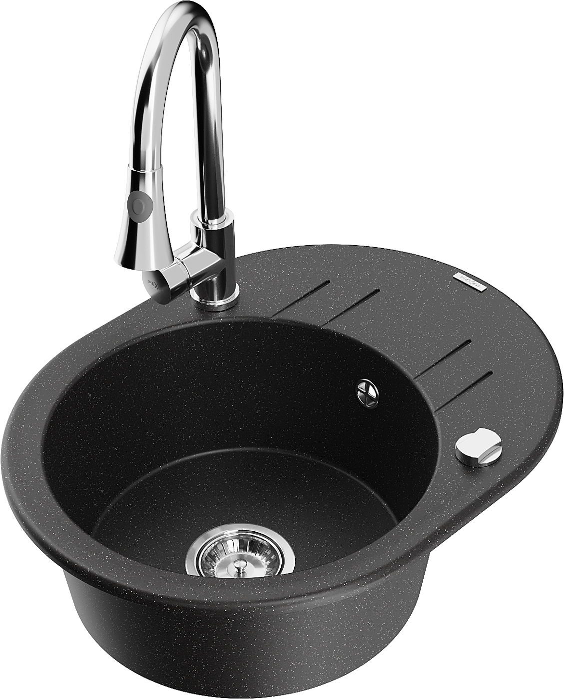 Mexen Kevin granitový dřez 1-komorový s odkapávačem a kuchyňskou baterií Elia, černý/stříbrný metalik - 6517-73-670101-00