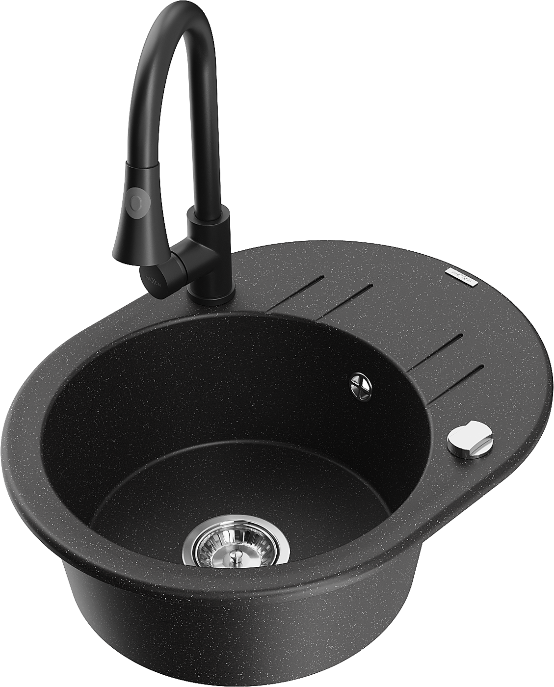 Mexen Kevin žulový dřez 1-komorový s odkapávačem a kuchyňskou baterií Elia, černý/stříbrný metalík - 6517-73-670101-70