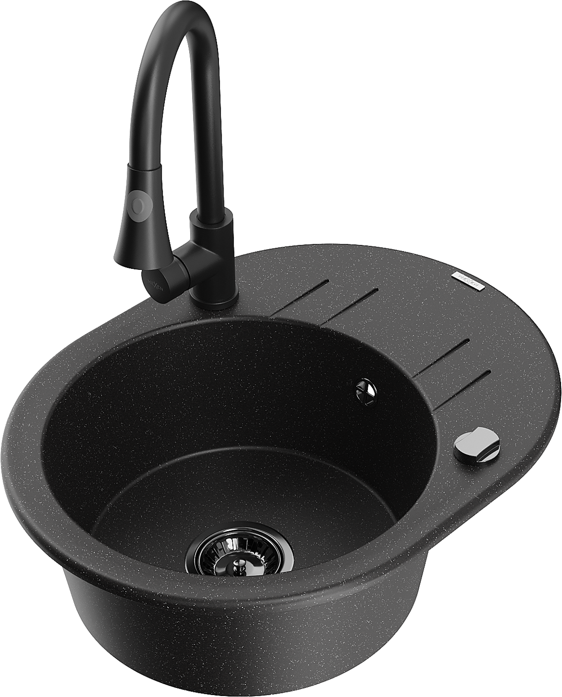 Mexen Kevin granitový dřez s 1 komorou s odkapávačem a kuchyňskou baterií Elia, černý/stříbrný metalík - 6517-73-670101-70-B
