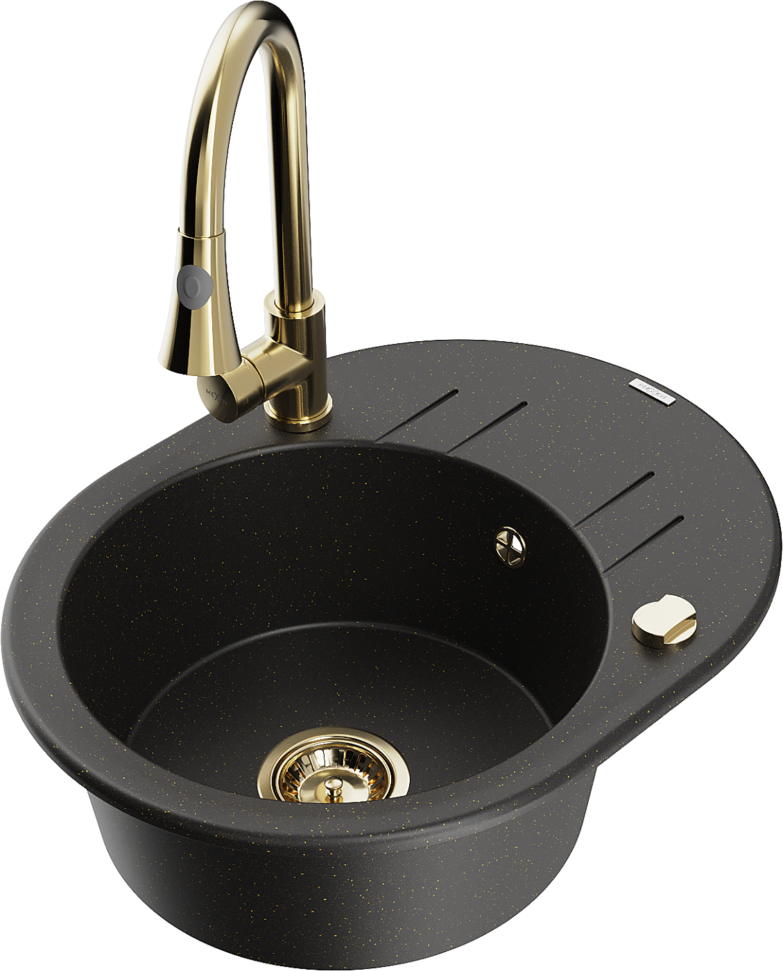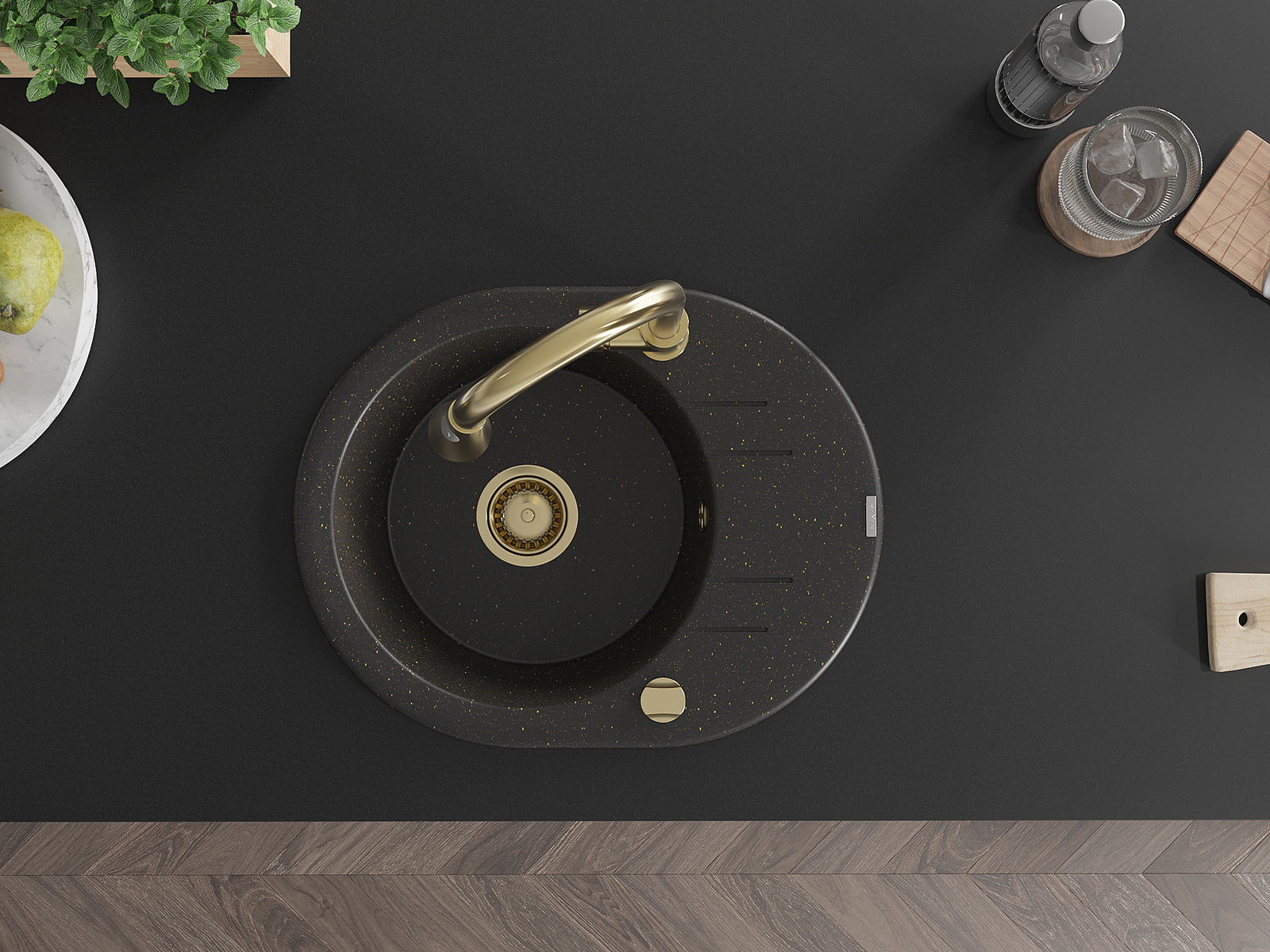 Mexen Kevin žulový dřez 1-komorový s odkapávačem a kuchyňskou baterií Elia, černý/zlatý metalik - 6517-75-670101-50