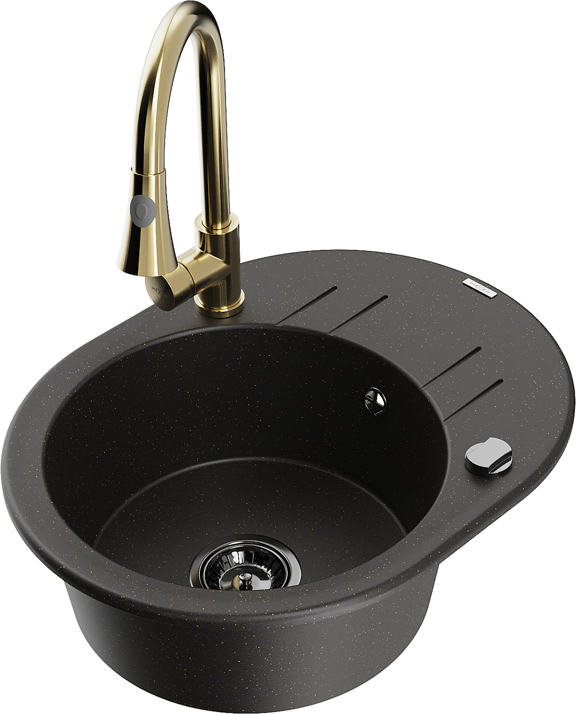 Mexen Kevin žulový dřez 1-komorový s odkapávačem a kuchyňskou baterií Elia, černý/zlatý metalický - 6517-75-670101-50-B