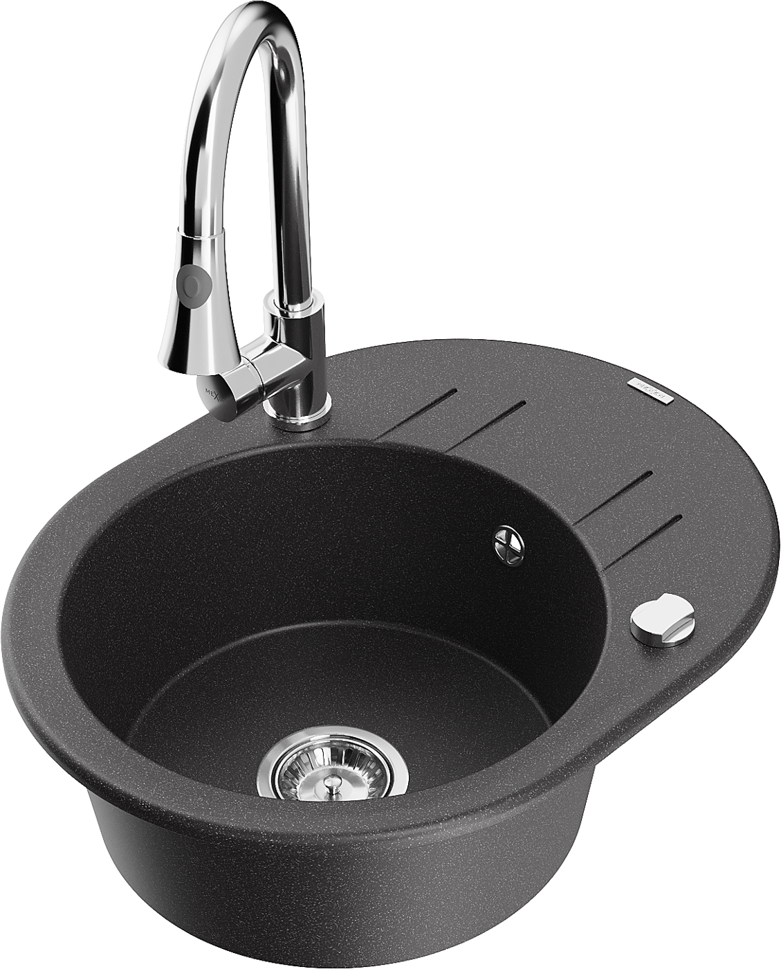 Mexen Kevin granitový dřez 1-komorový s odkapávačem a kuchyňskou baterií Elia, černý s tečkami - 6517-76-670101-00