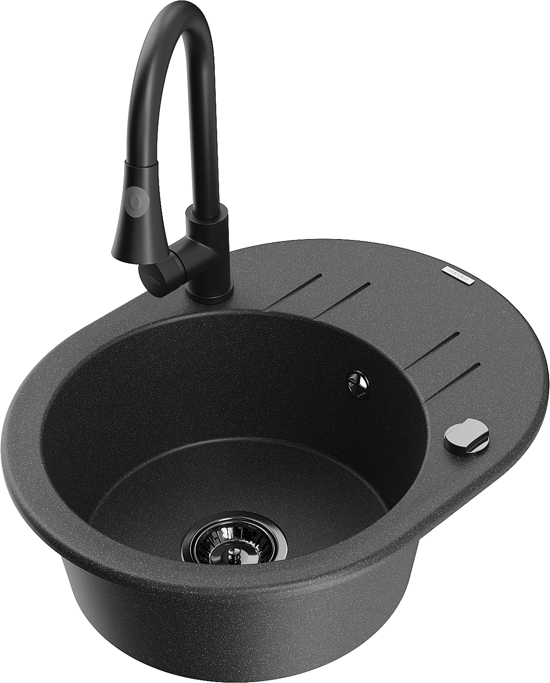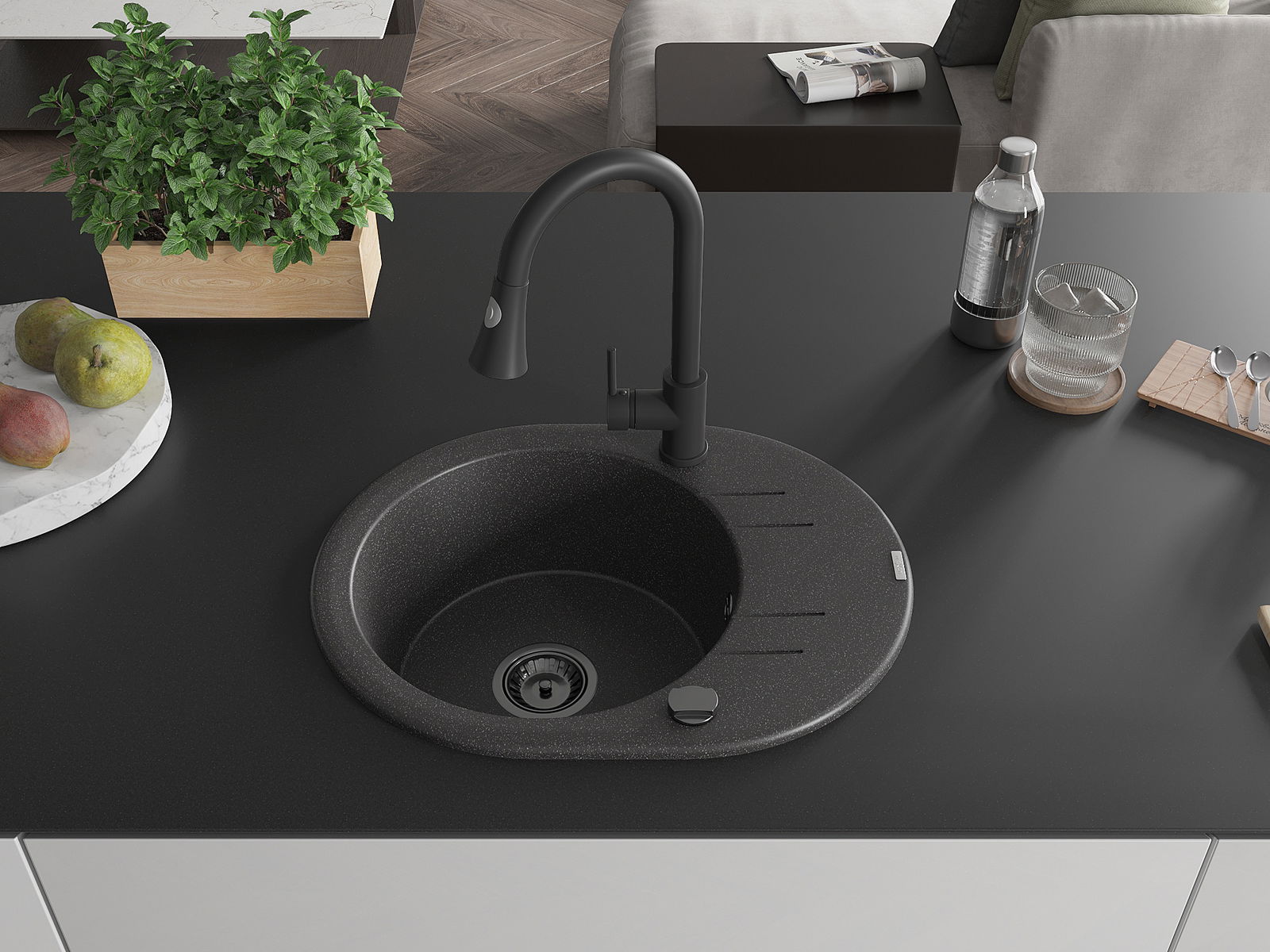Mexen Kevin granitový dřez 1-komorový s odkapávačem a kuchyňskou baterií Elia, černý s tečkami - 6517-76-670101-70-B