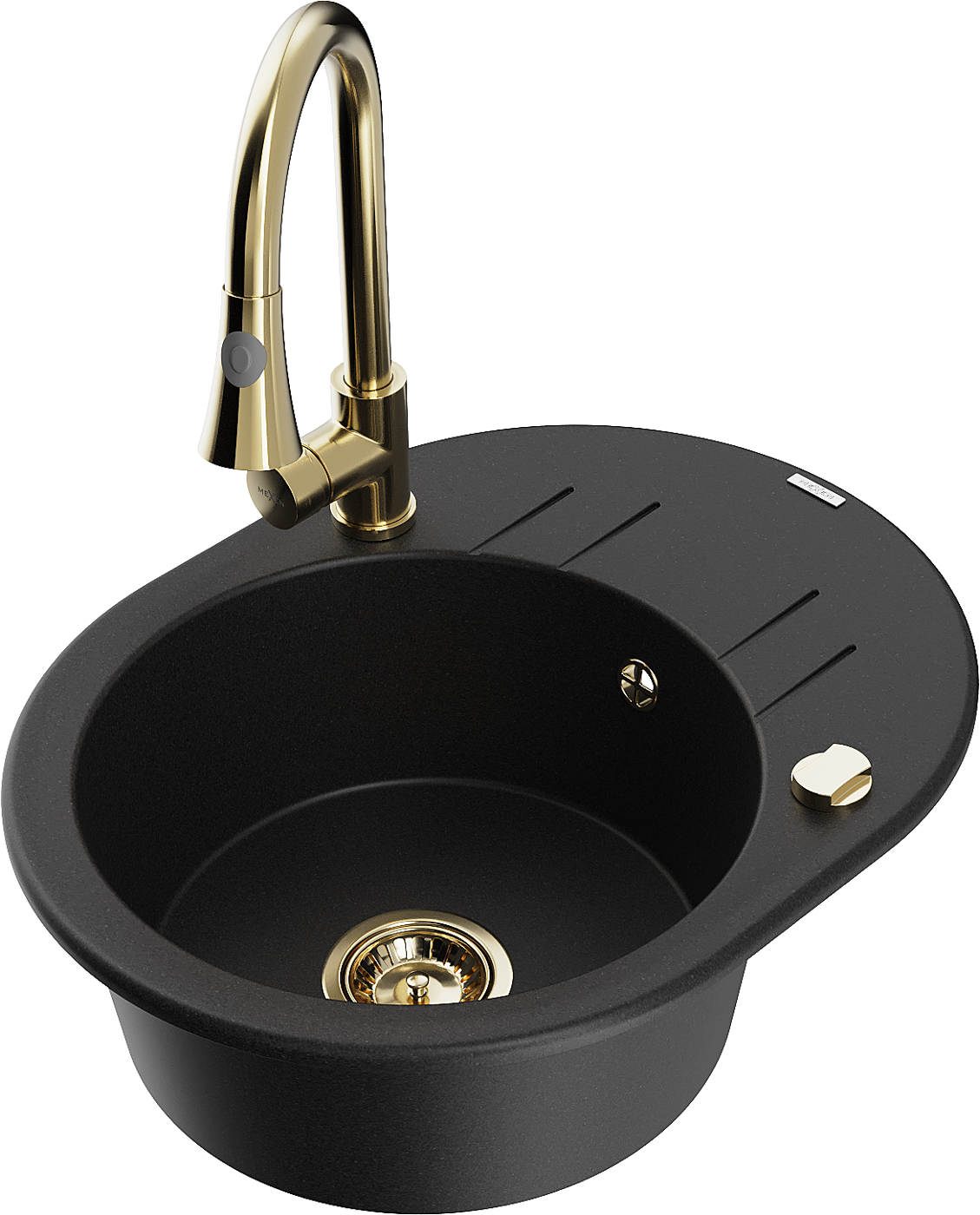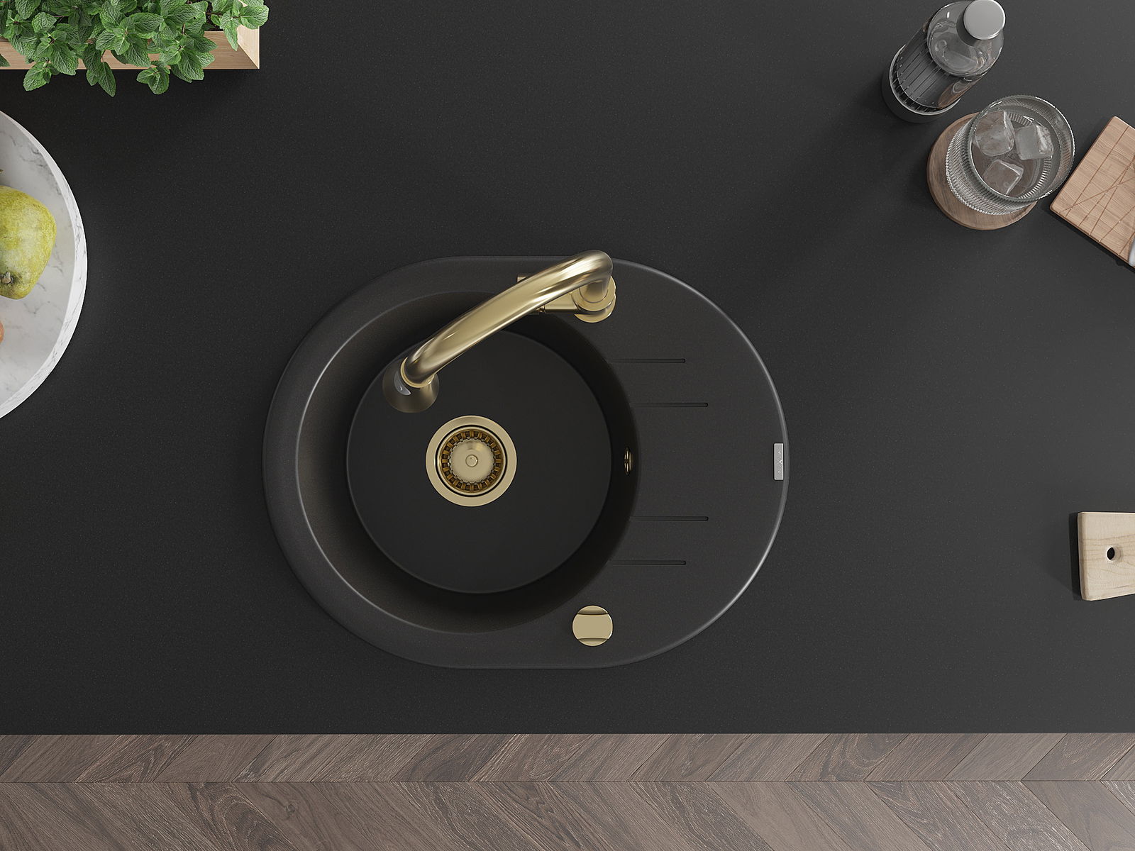 Mexen Kevin žulový kuchyňský dřez s 1 komorou, odkapávačem a kuchyňskou baterií Elia, černý - 6517-77-670101-50