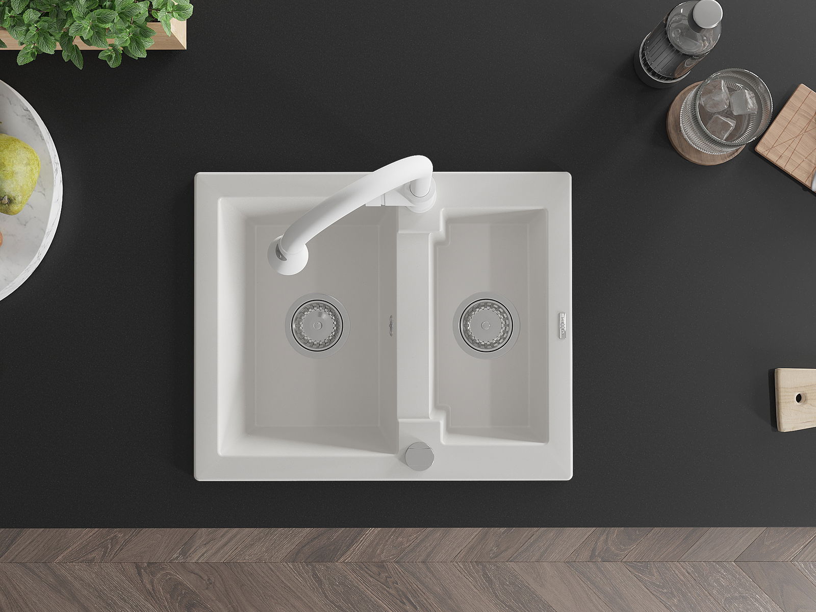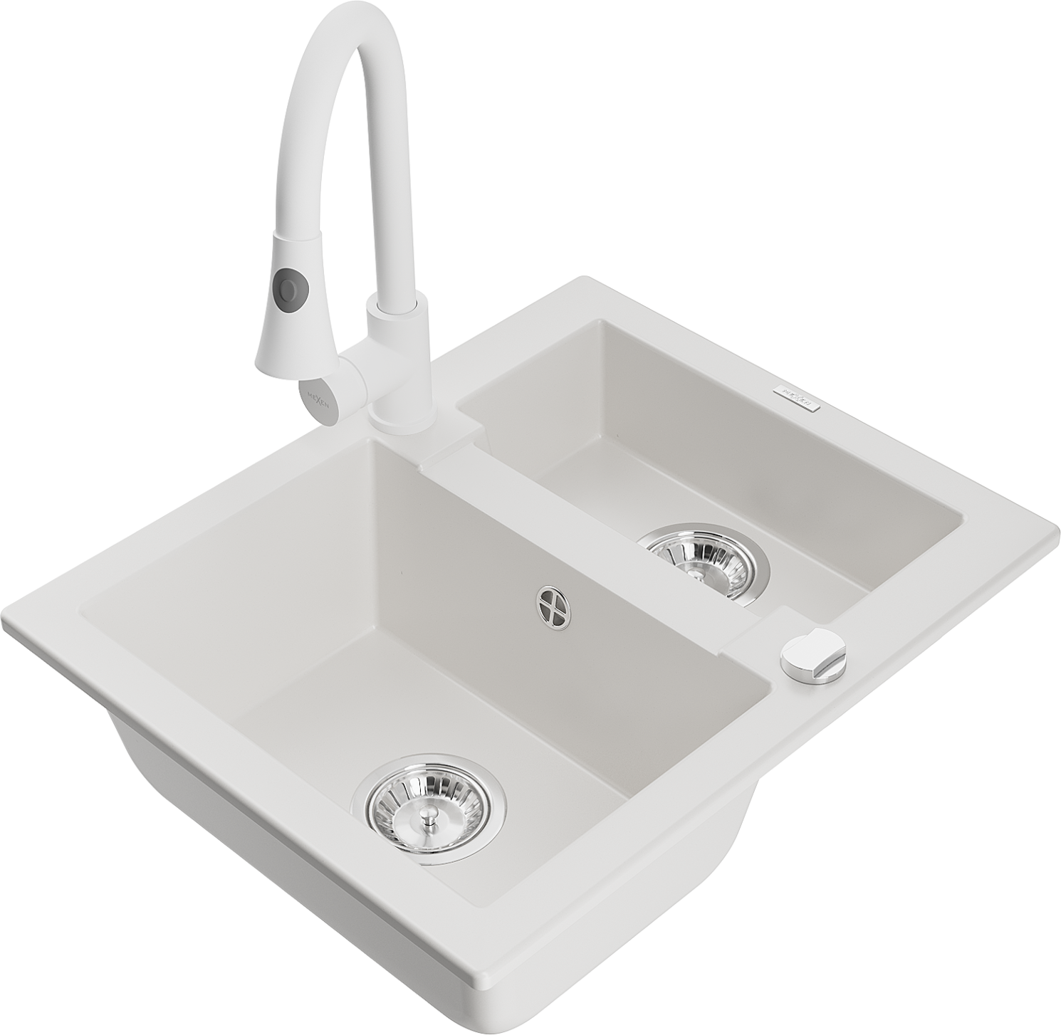 Mexen Carlos granitový dřez s 1,5 komorami s kuchyňskou baterií Elia, bílý - 6518-20-670101-20