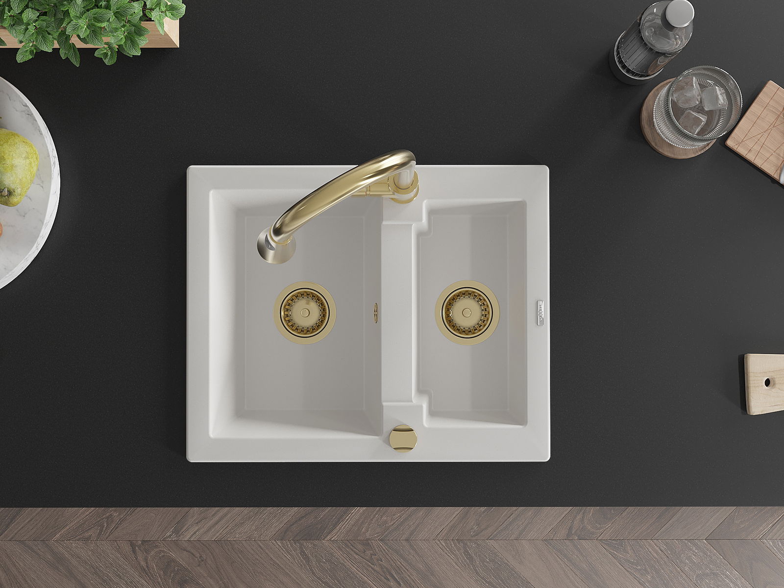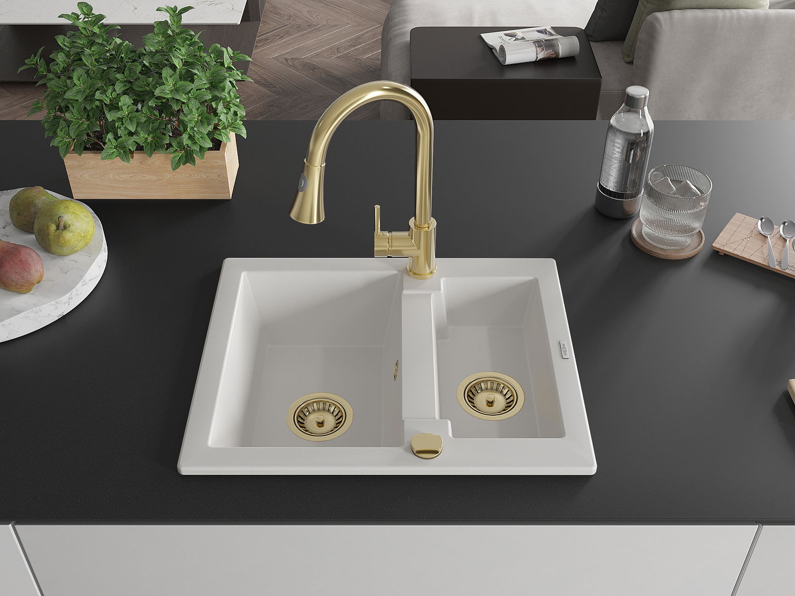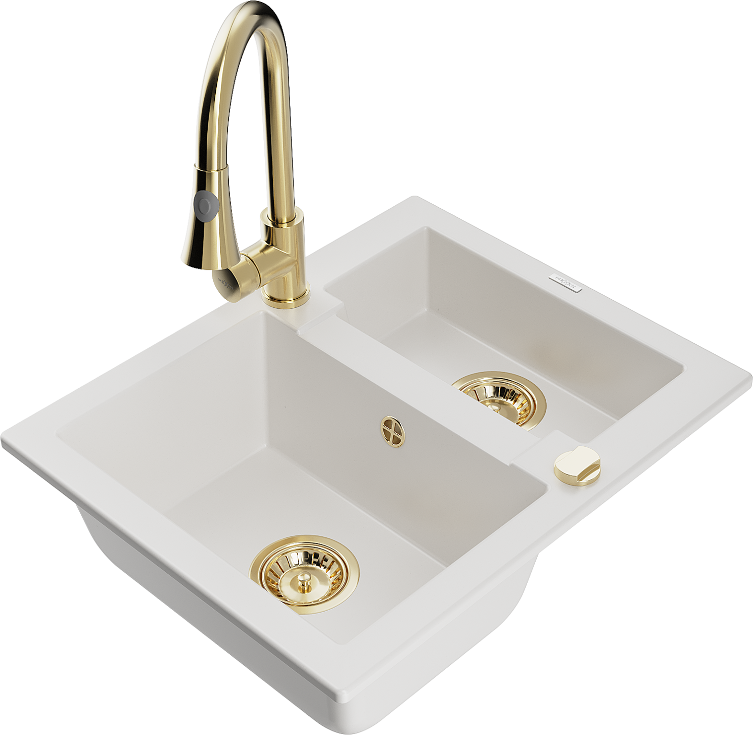 Mexen Carlos granitový dřez 1,5-komorový s kuchyňskou baterií Elia, bílý - 6518-20-670101-50