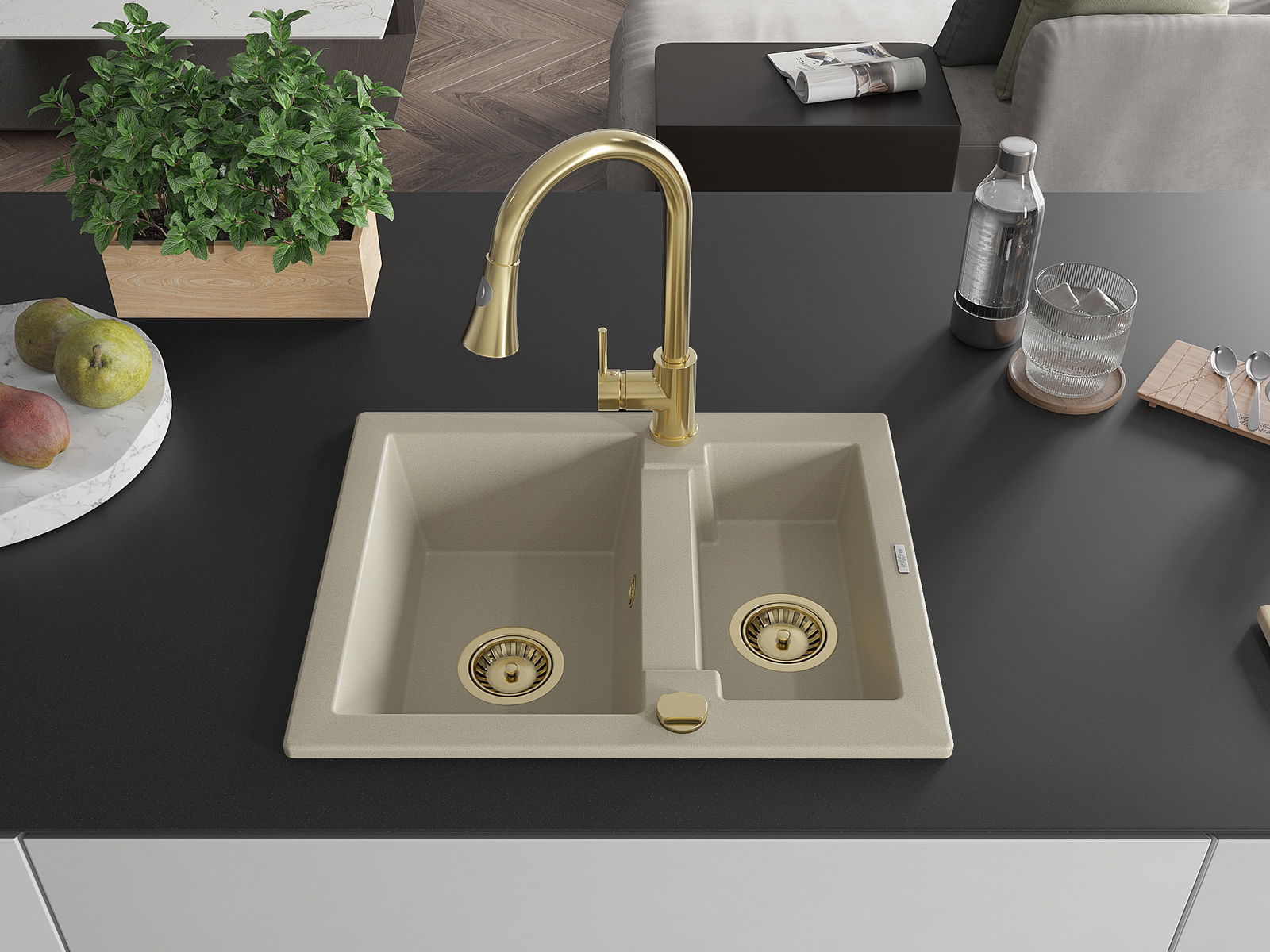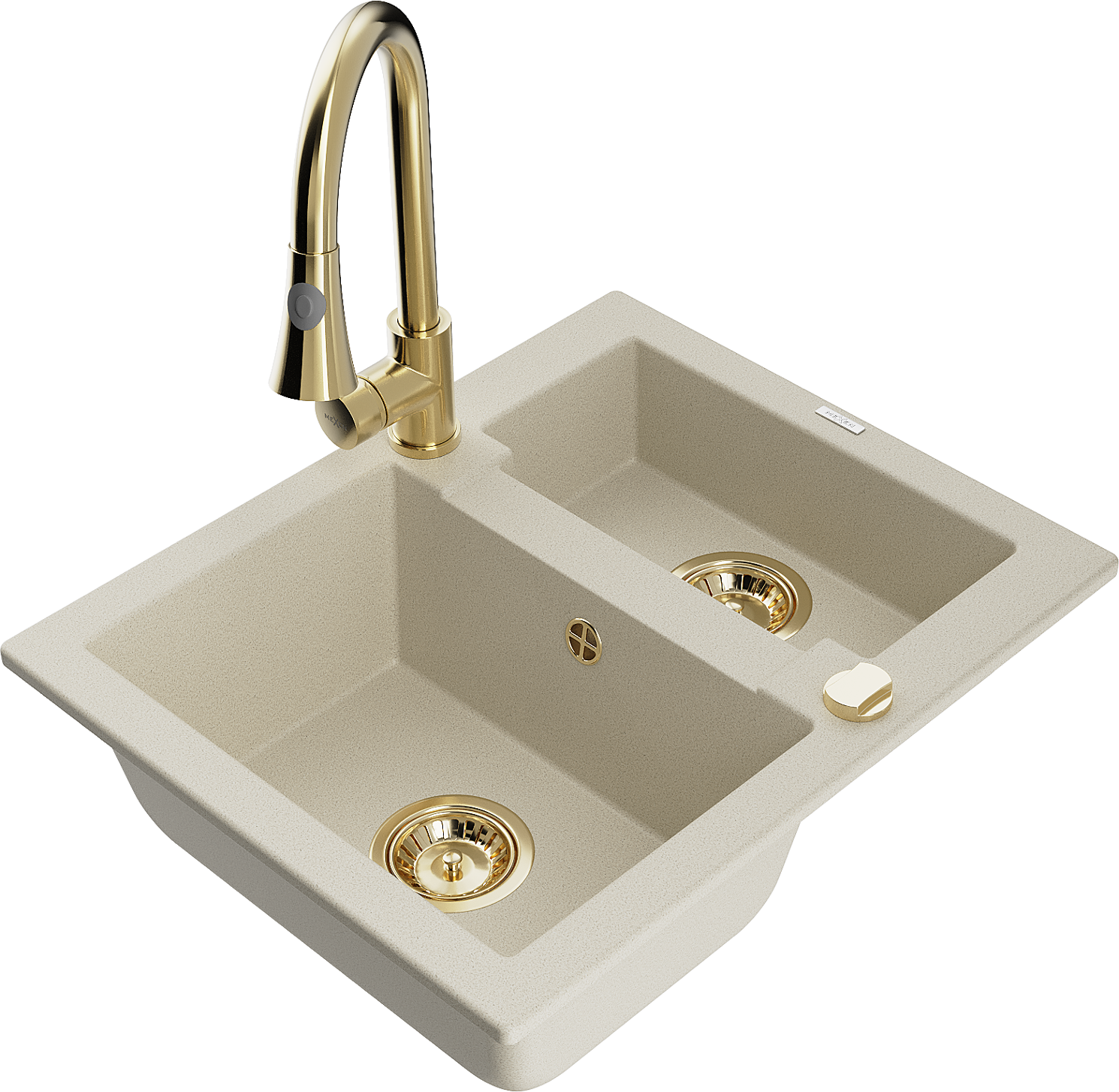 Mexen Carlos granitový dřez 1,5-komorový s kuchyňskou baterií Elia, béžový - 6518-69-670101-50