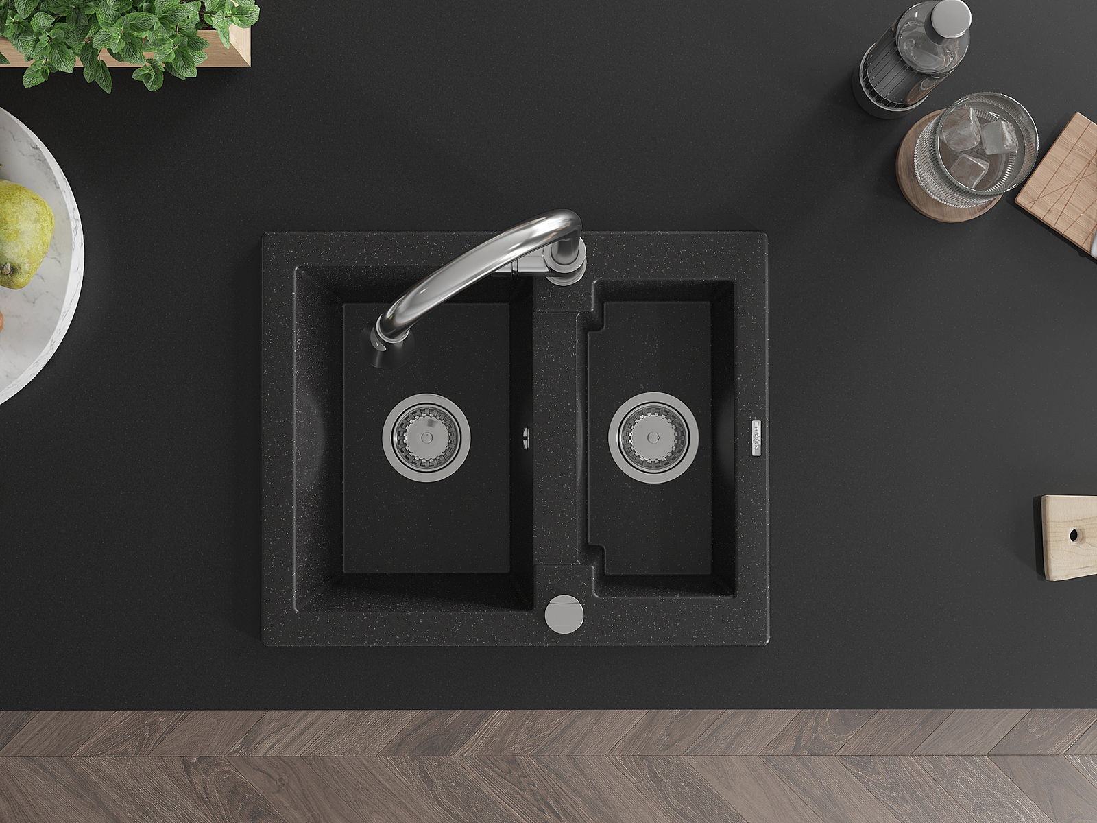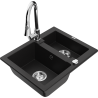 Mexen Carlos granitový dřez 1,5-komorový s kuchyňskou baterií Elia, černá/stříbrná metalíza - 6518-73-670101-00