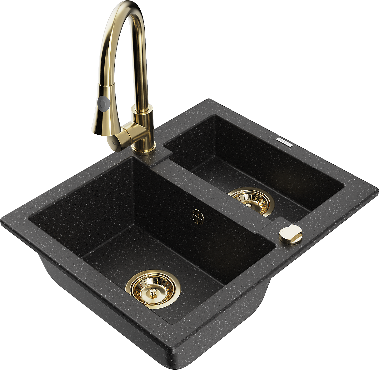 Mexen Carlos žulový dřez 1,5-komorový s kuchyňskou baterií Elia, černý/stříbrný metalík - 6518-73-670101-50