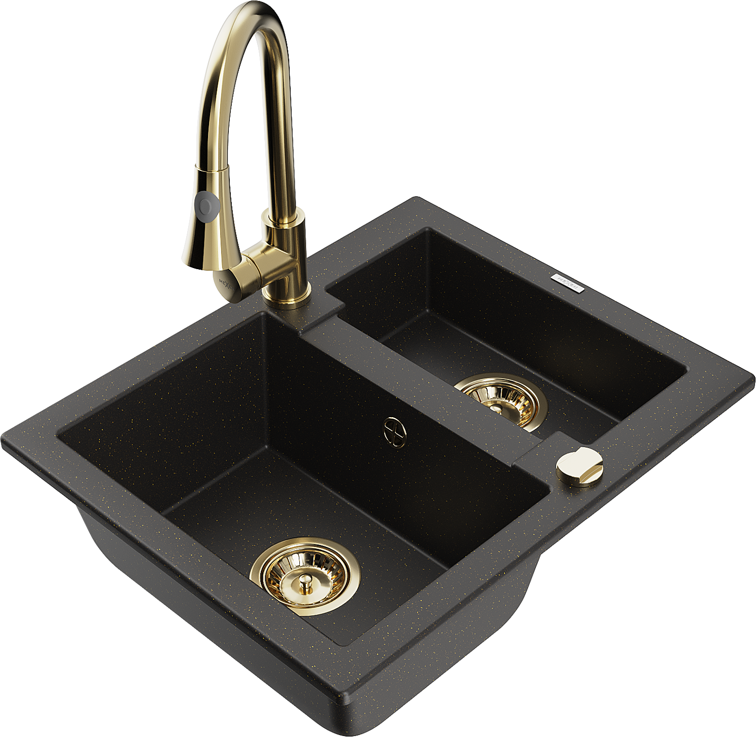 Mexen Carlos granitový dřez 1,5-komorový s kuchyňskou baterií Elia, černý/zlatý metalik - 6518-75-670101-50