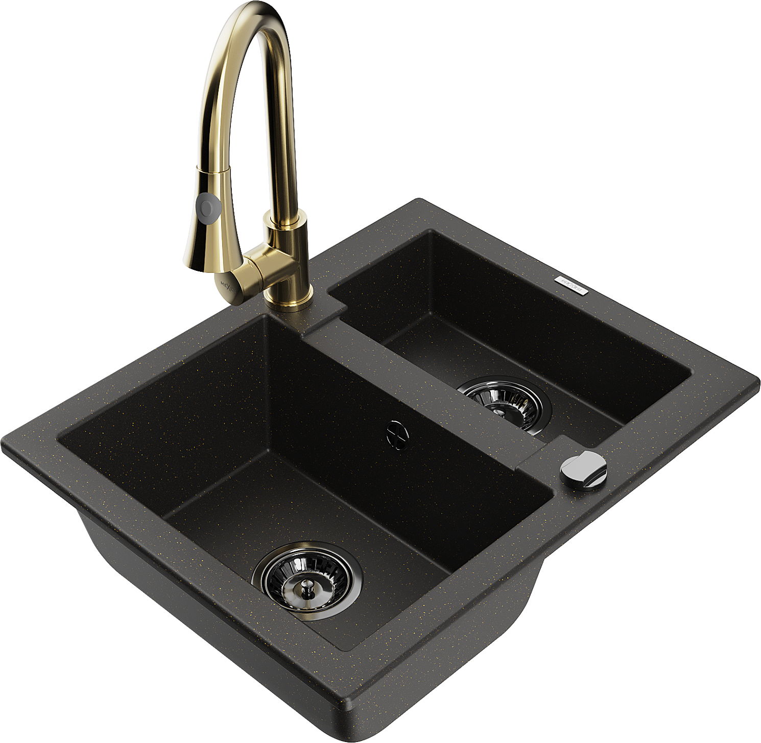 Mexen Carlos žulový dřez 1,5-komorový s kuchyňskou baterií Elia, černý/zlatý metalik - 6518-75-670101-50-B