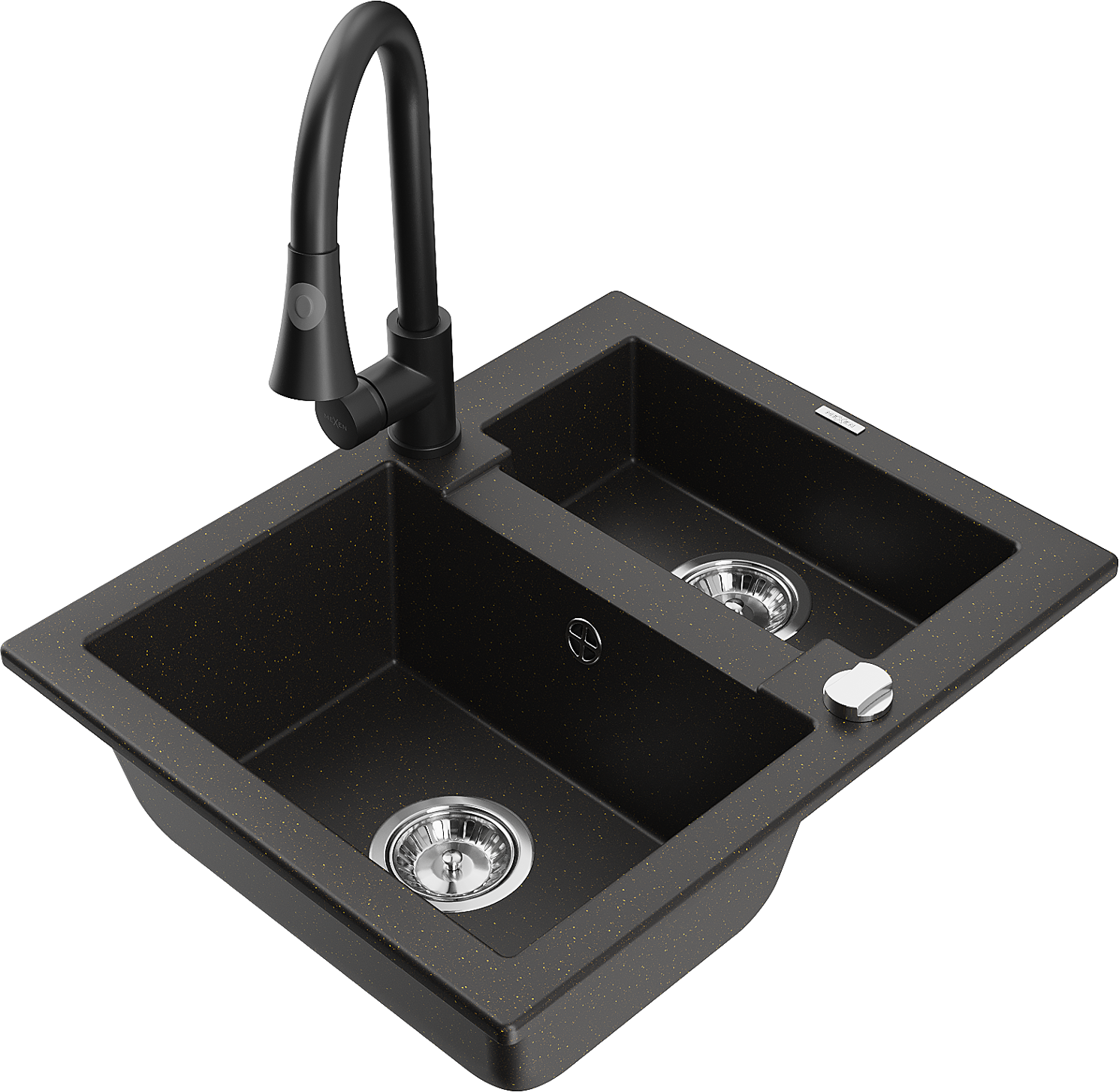Mexen Carlos granitový dřez 1,5-komorový s kuchyňskou baterií Elia, černý/zlatý metalický - 6518-75-670101-70