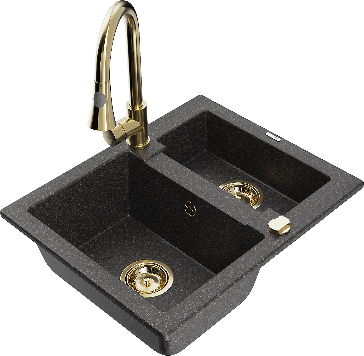 • Mexen Carlos granitový dřez 1,5-komorový s kuchyňskou baterií Elia, černý skvrnitý - 6518-76-670101-50