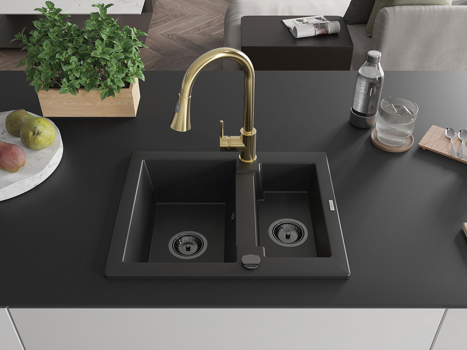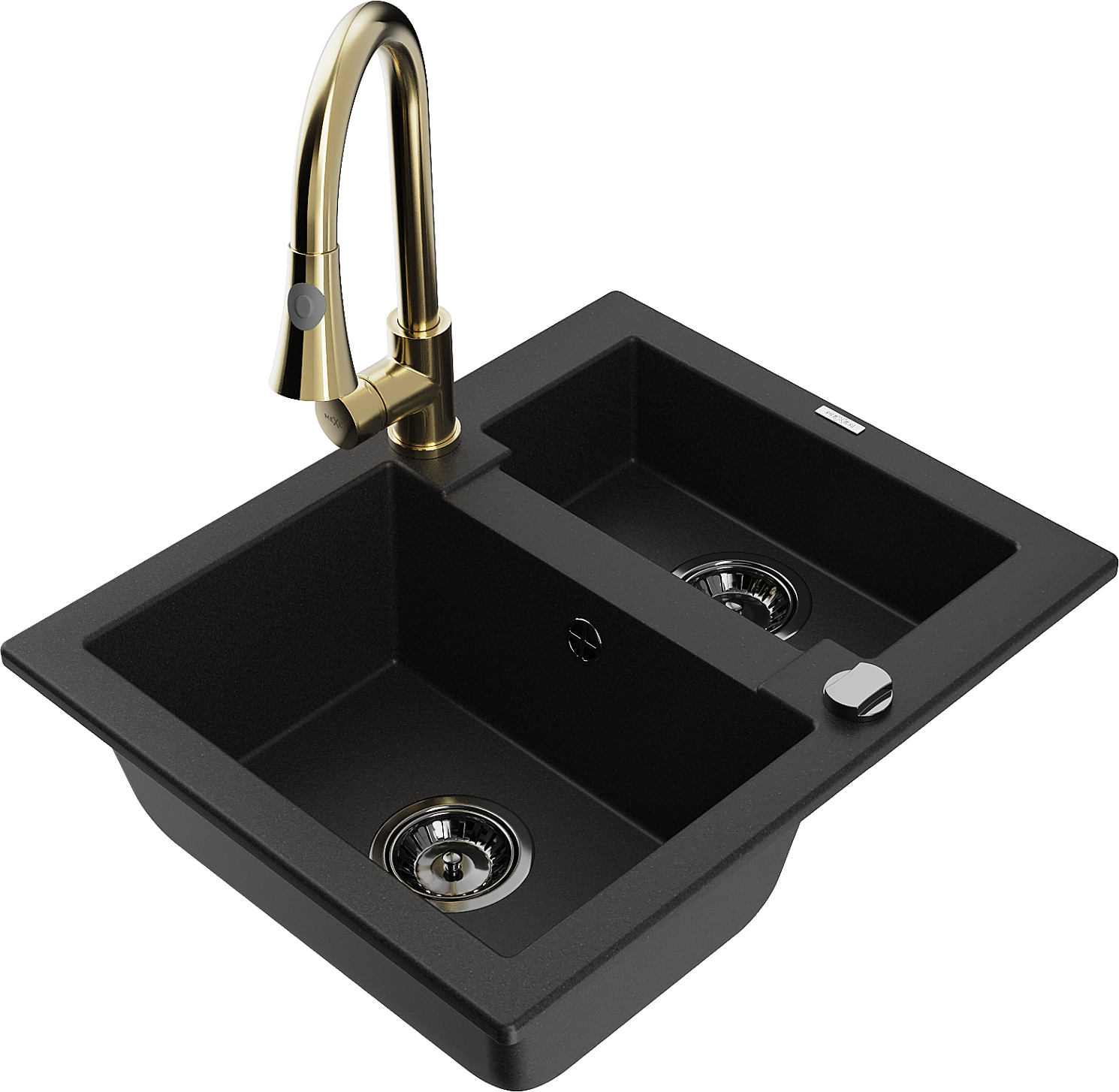 Mexen Carlos granitový dřez 1,5-komorový s kuchyňskou baterií Elia, černý - 6518-77-670101-50-B