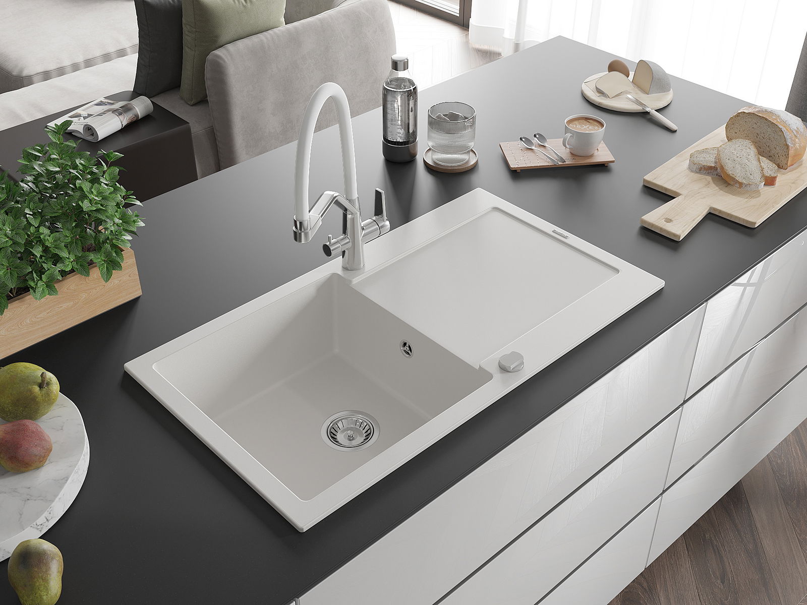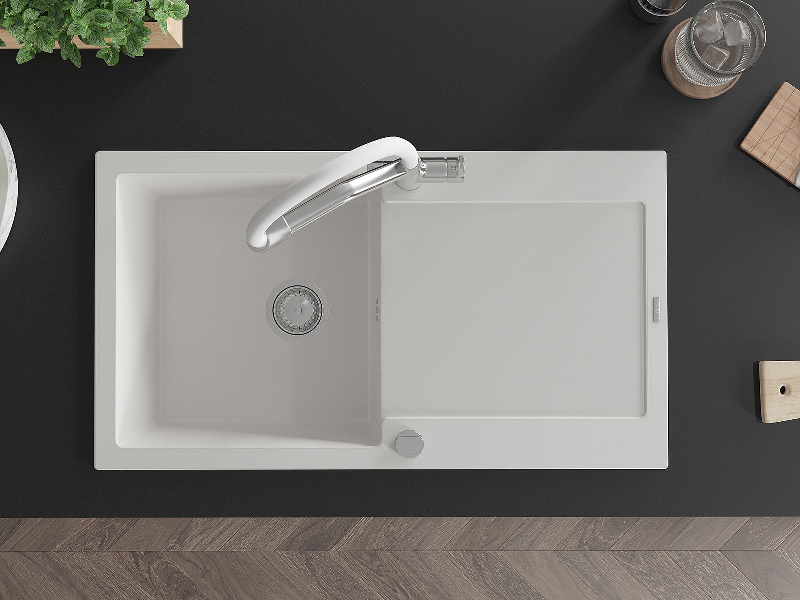 Mexen Leo granitový dřez 1-komorový s odkapávačem a kuchyňskou baterií Duo, bílý - 6501-20-671701-02