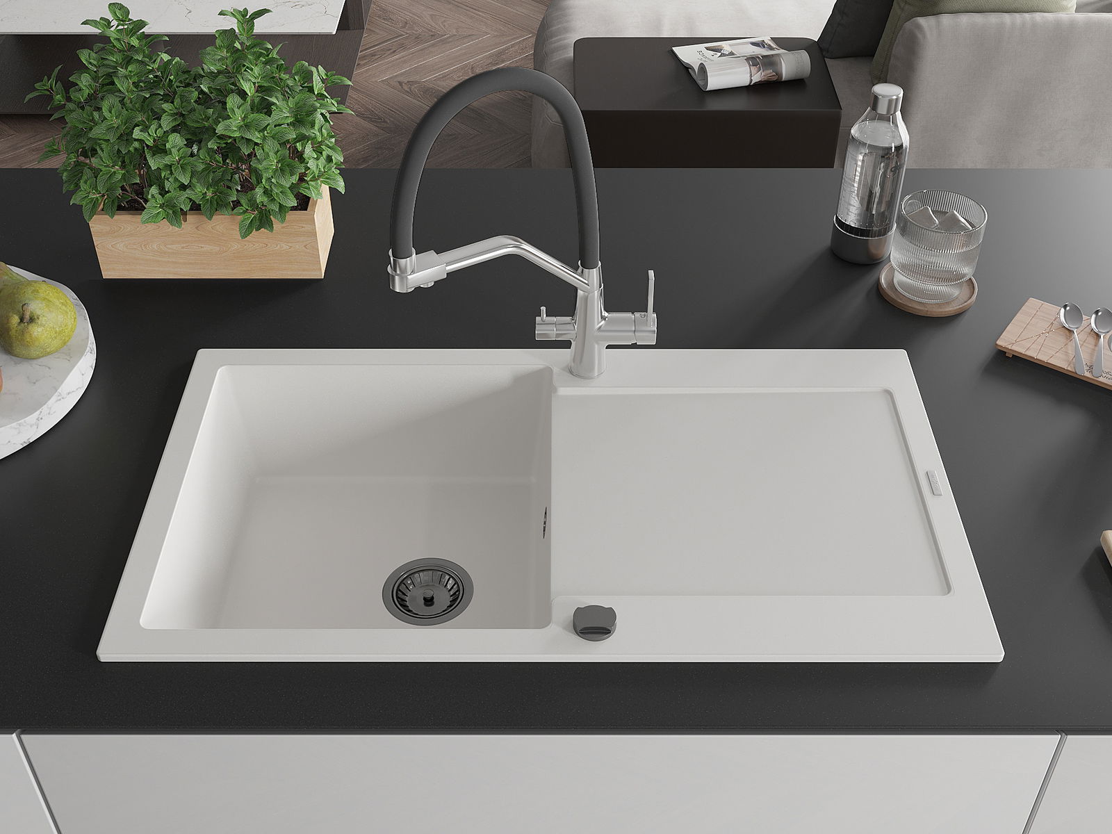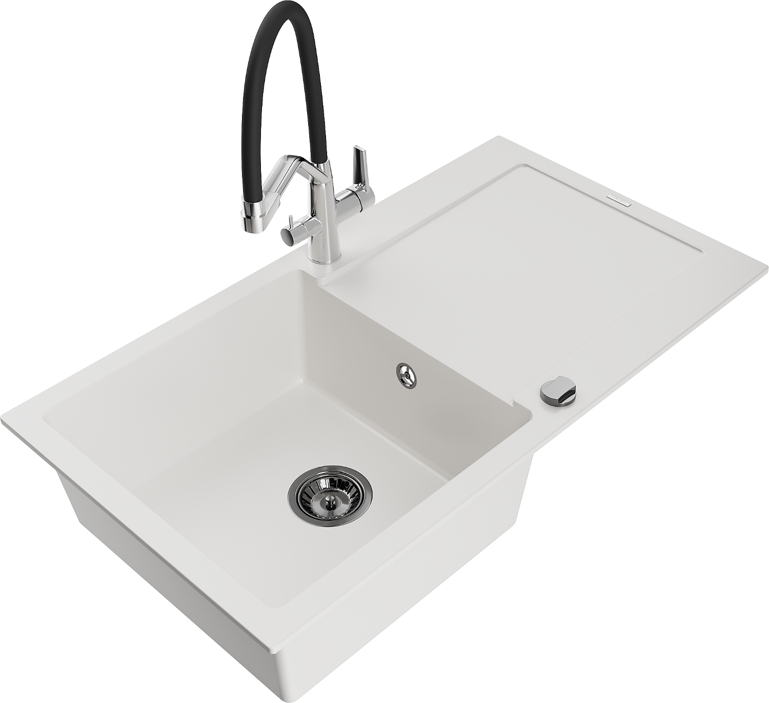 Mexen Leo granitový dřez 1-komorový s odkapávačem a kuchyňskou baterií Duo, bílý - 6501-20-671701-07-B
