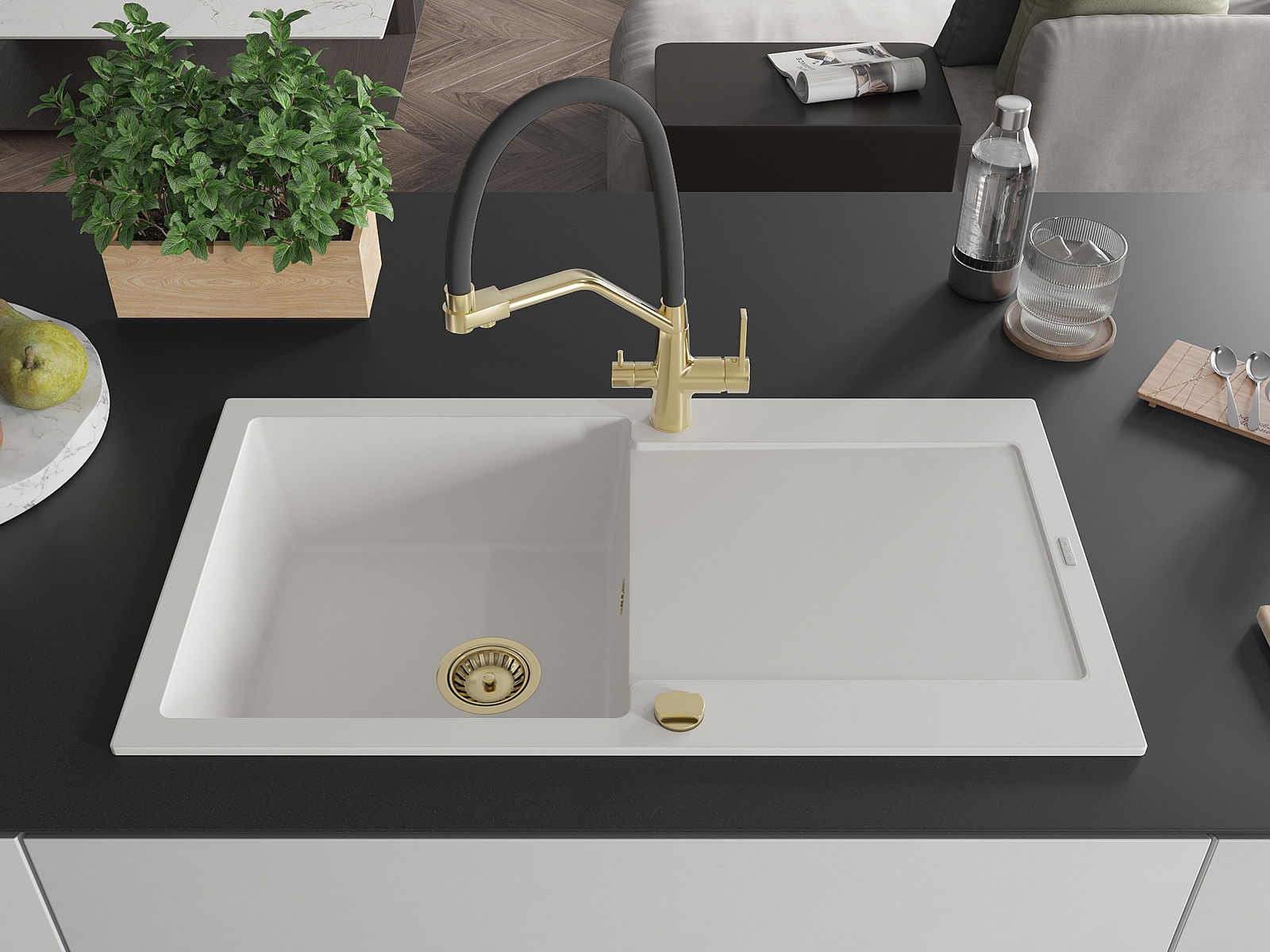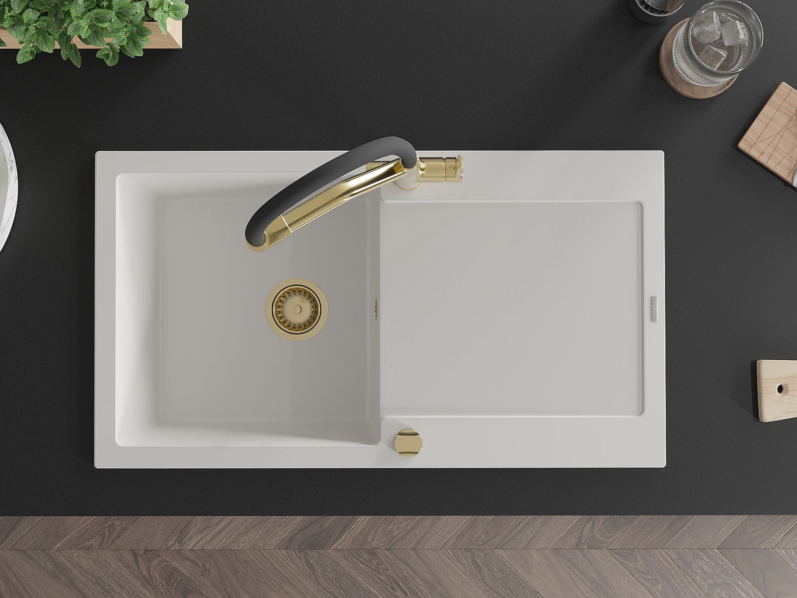 Mexen Leo granitový dřez 1-komorový s odkapávačem a kuchyňskou baterií Duo, bílý - 6501-20-671701-57-G