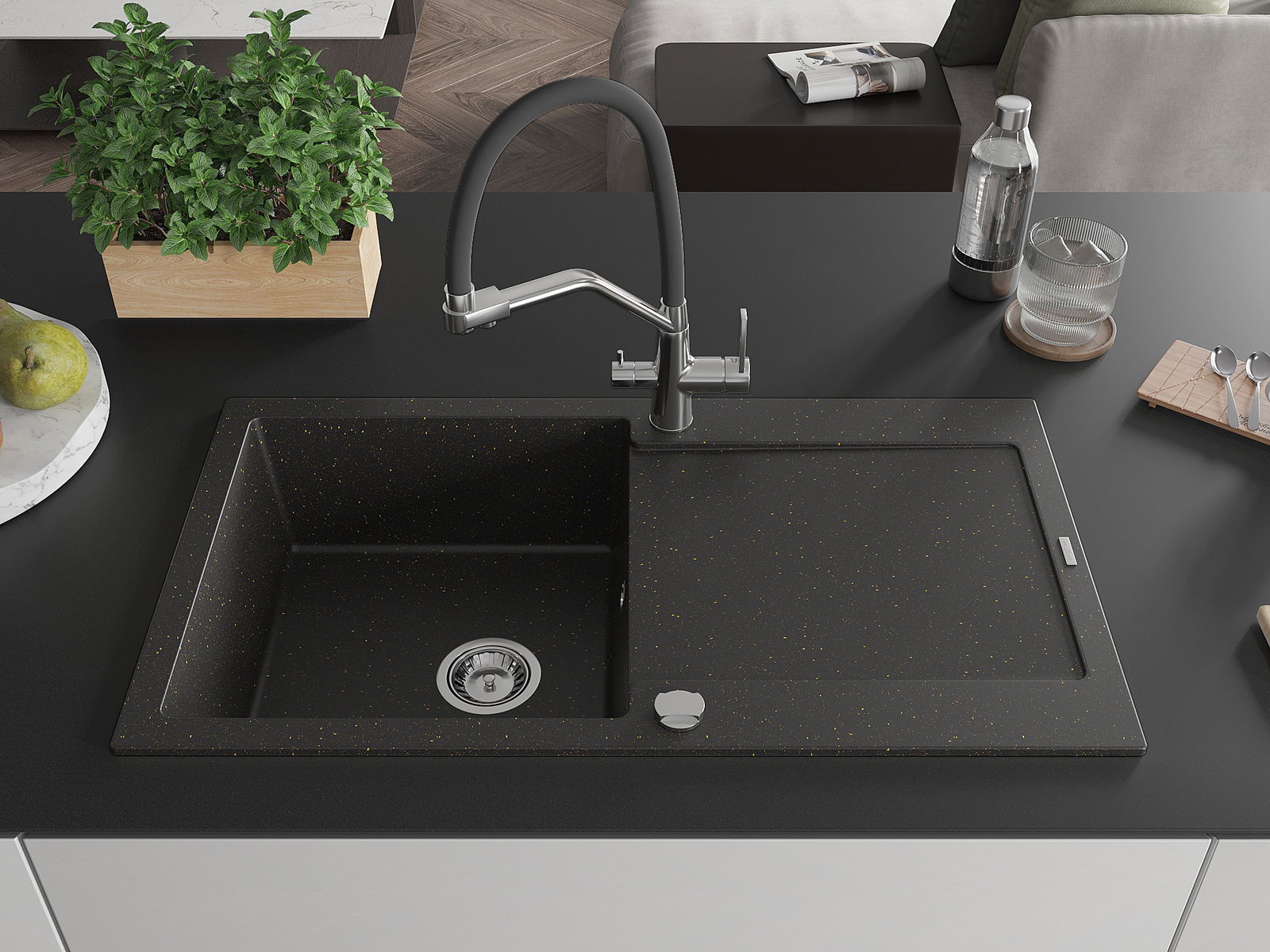 Mexen Leo dřez granitový 1-komorový s odkapávačem a kuchyňskou baterií Duo, černý/zlatý metalík - 6501-75-671701-07