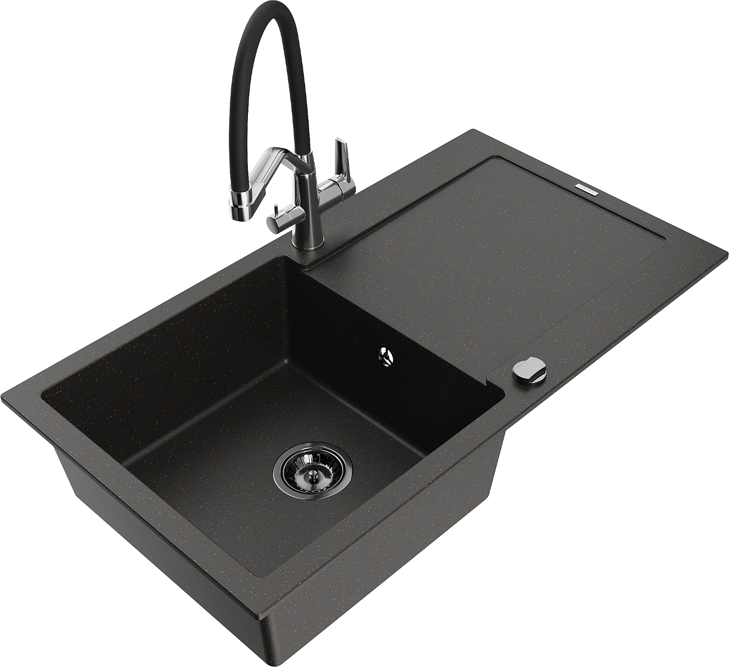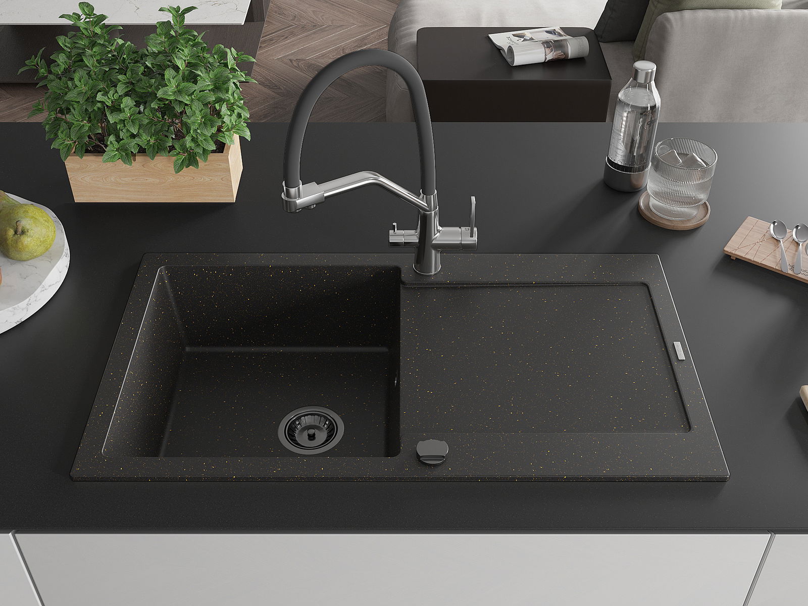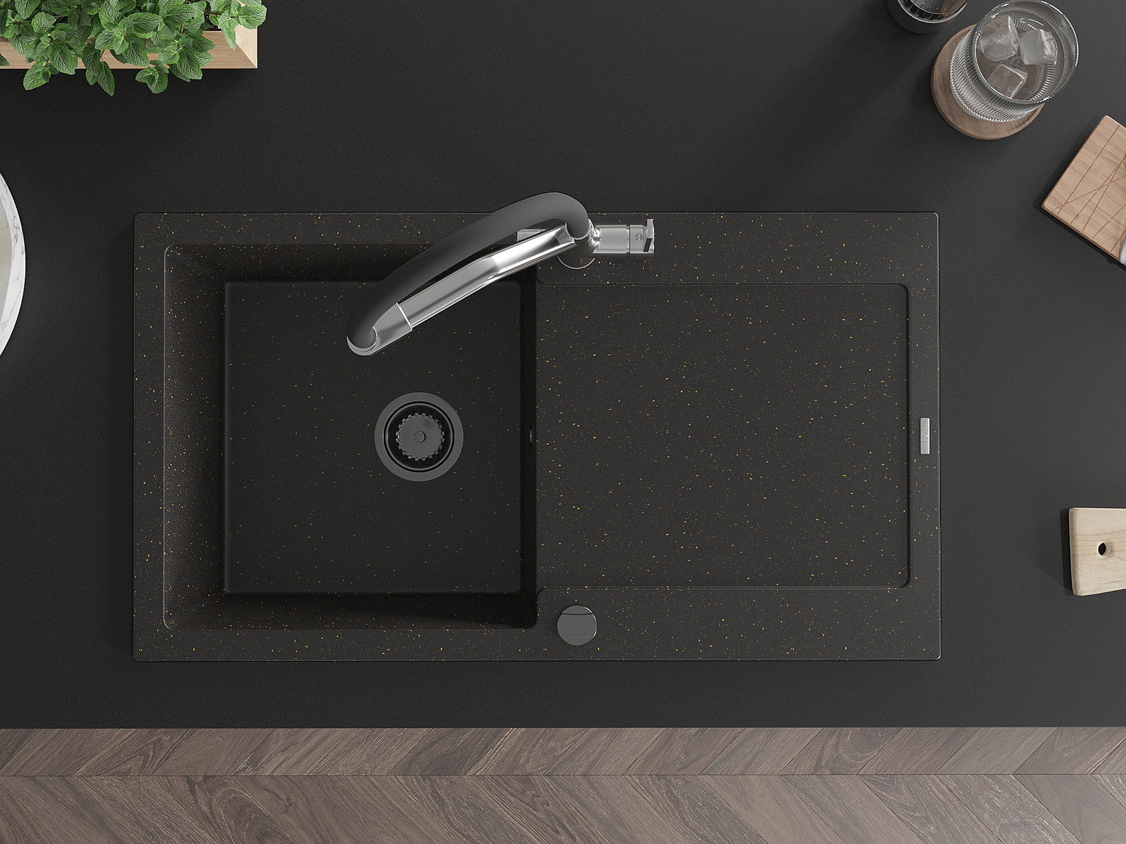 Mexen Leo granitový dřez 1-komorový s odkapávačem a kuchyňskou baterií Duo, černý/zlatý metalik - 6501-75-671701-07-B